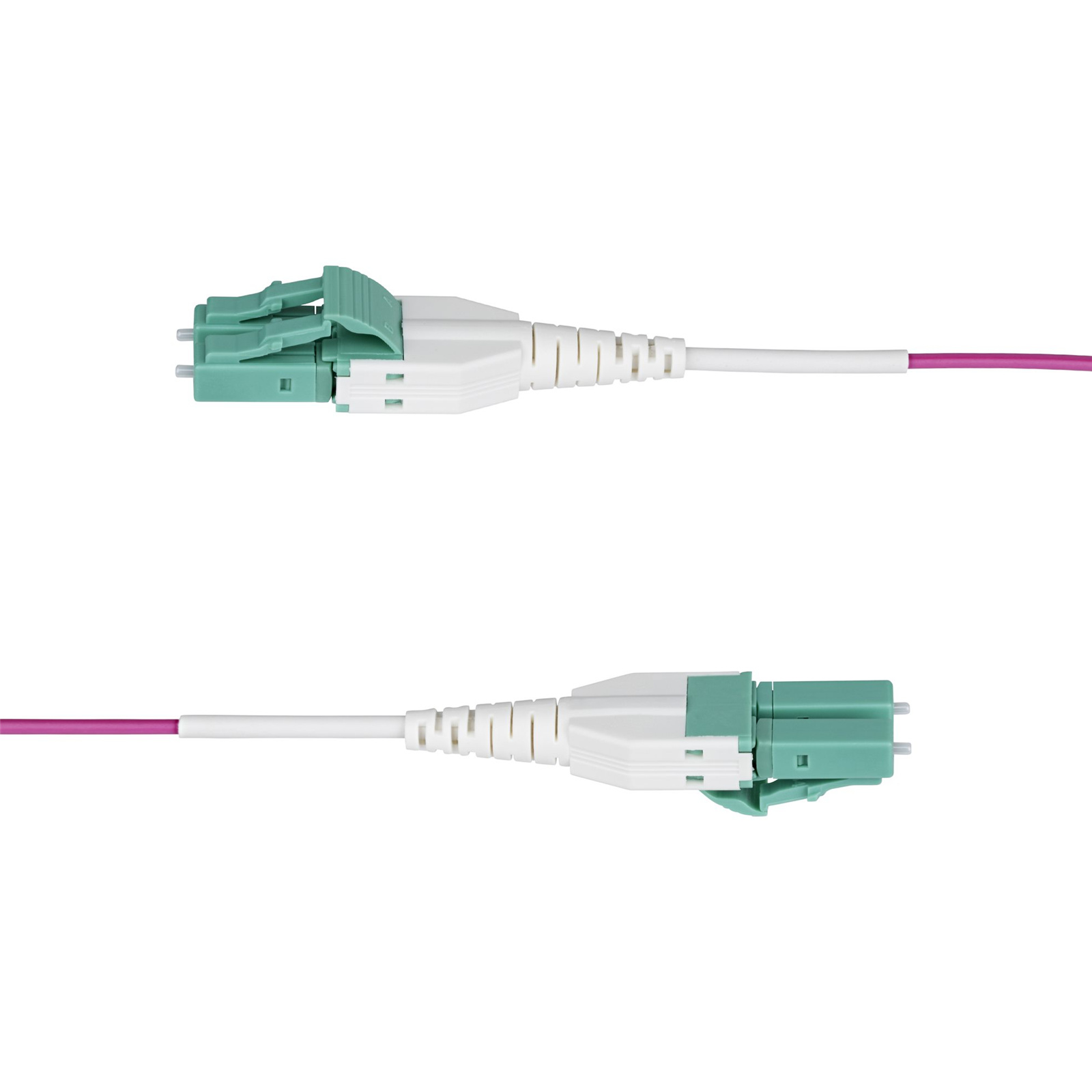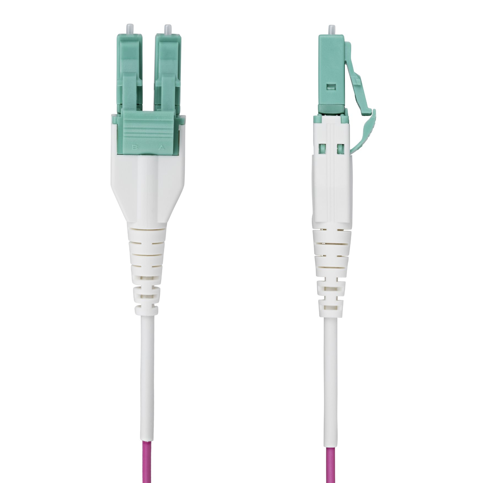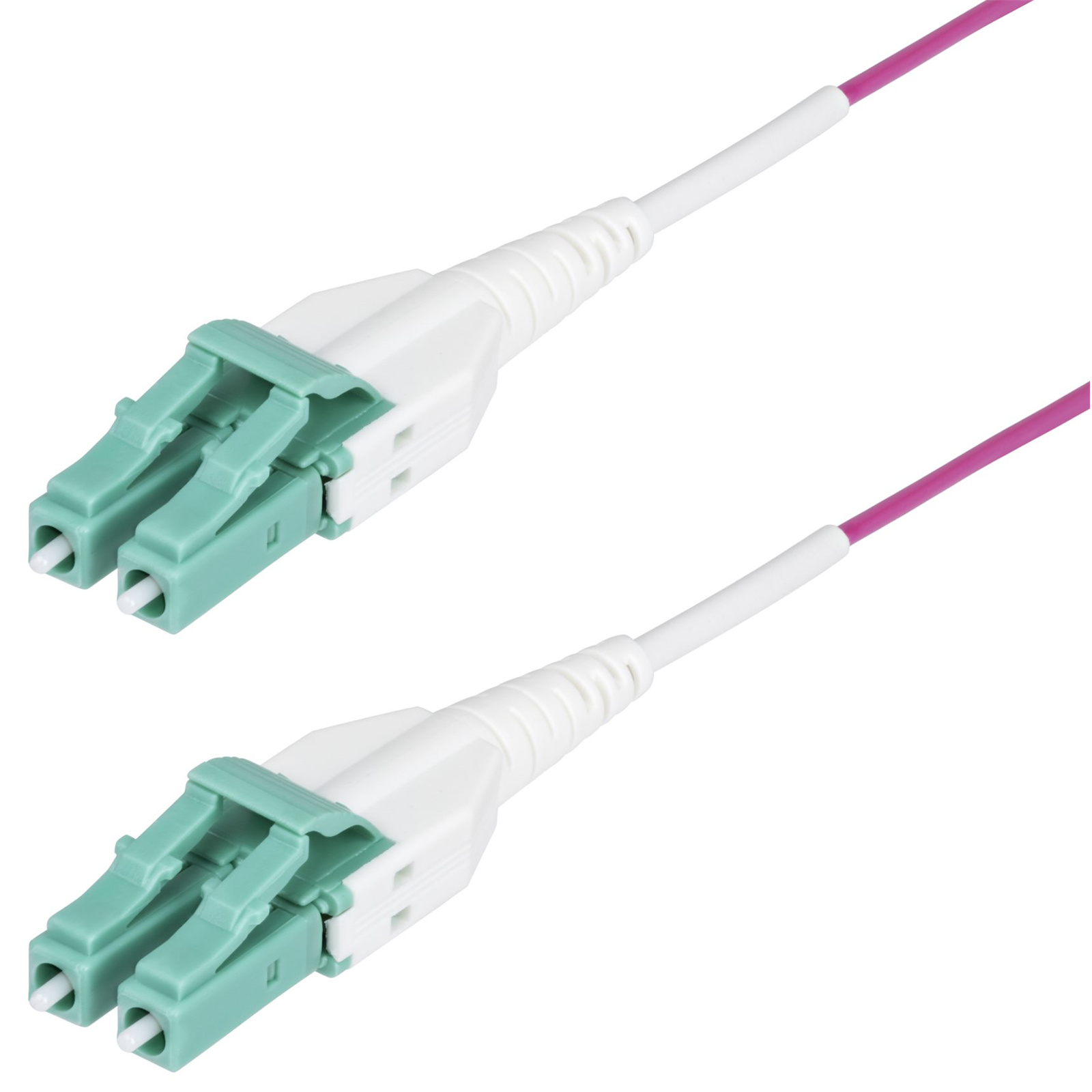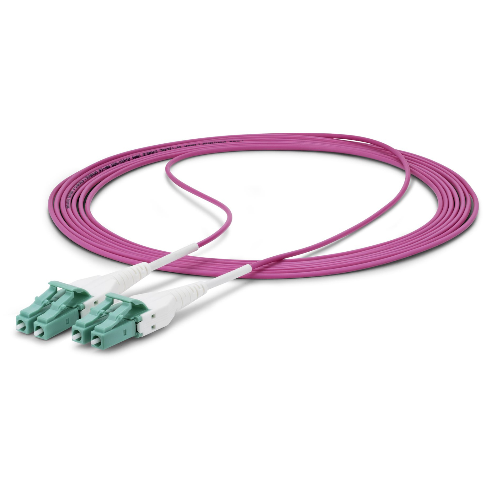This OM4 LC to LC Multimode Duplex Fiber Optic Patch cable delivers reliable connectivity across 40 and 100 Gigabit networks. The TIA-standard Erika Violet jacket clearly distinguishes OM4 from Aqua OM3/OM4 cabling, eliminating guesswork in critical network setups. The compact uniboot connector design enables easy insertion and removal in high-density installations.