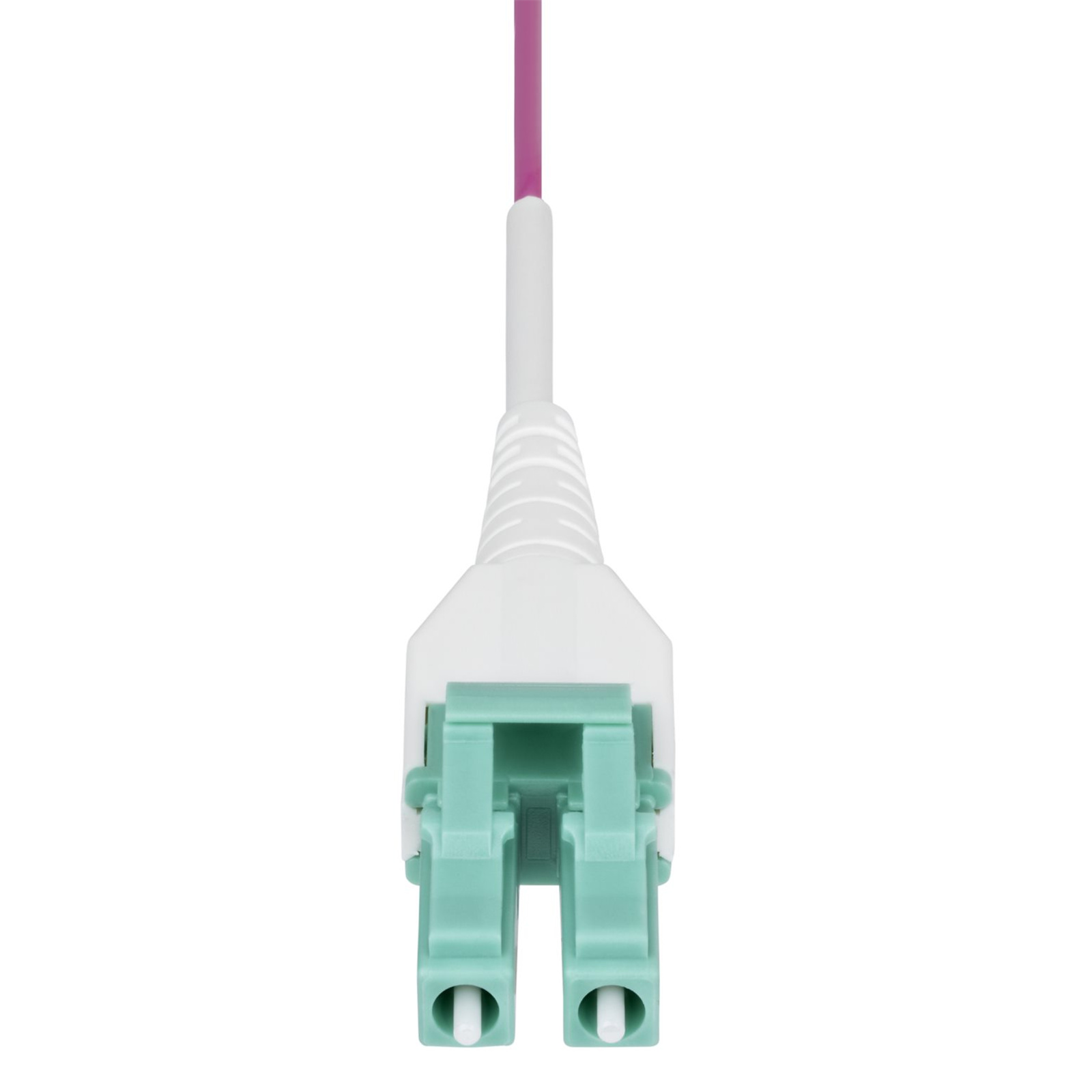 Built with laser-optimized multimode fiber (LOMMF), the OM4 fiber patch cable is ideal for 850 nm and 1350 nm Vertical Cavity Surface Emitting Laser (VCSEL) and LED sources. Precision-manufactured ceramic ferrules maintain accurate fiber alignment to prevent connectivity issues and minimize insertion loss. Designed for reliability in high-density network applications, the LC to LC UPC polished fiber ends greatly improves return loss characteristics over older PC polishing techniques which may negatively affect performance.