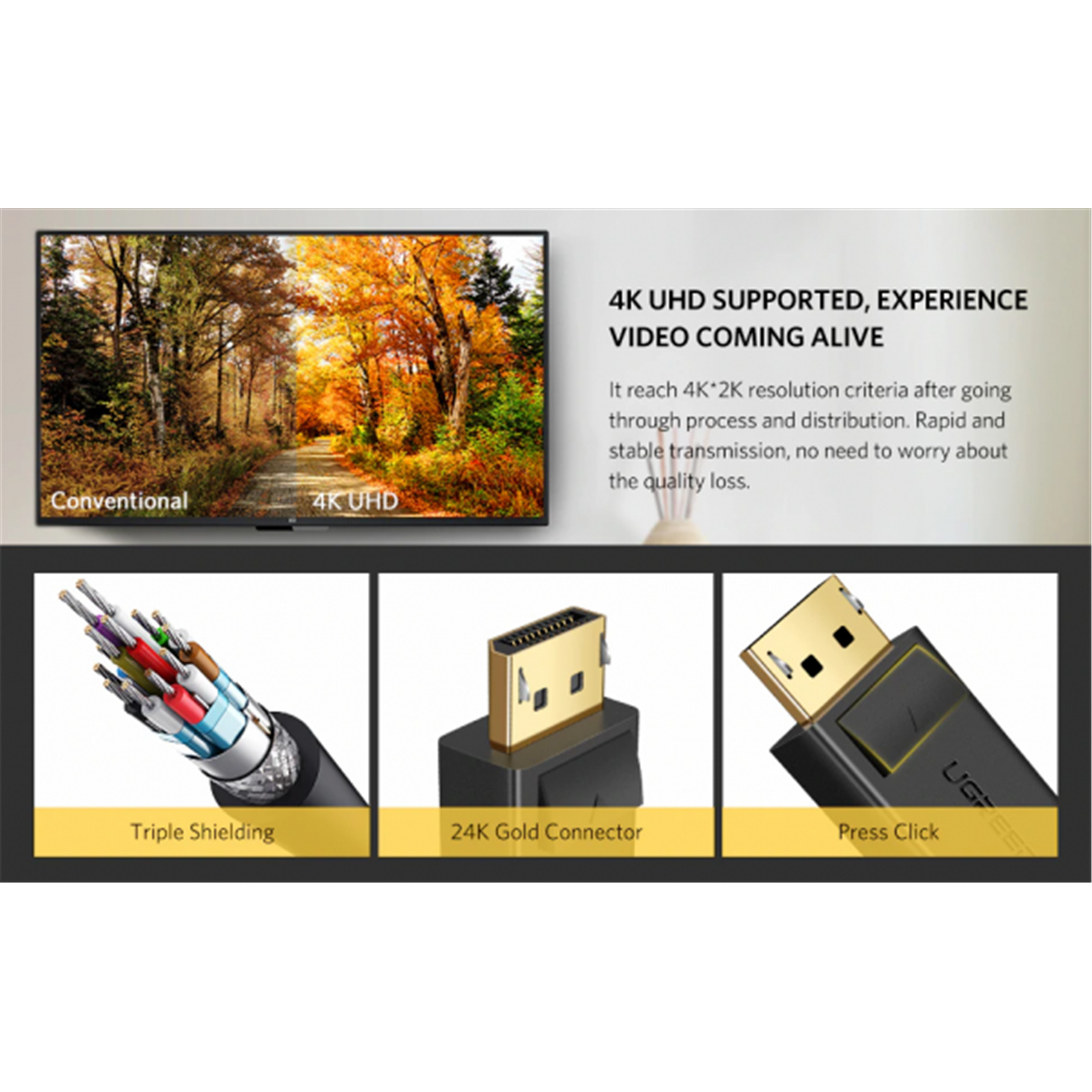 UGREEN UG-10245 4K - 60Hz DisplayPort Cable - 1.5m 3D - Gold-Plated - Press Click Connector
