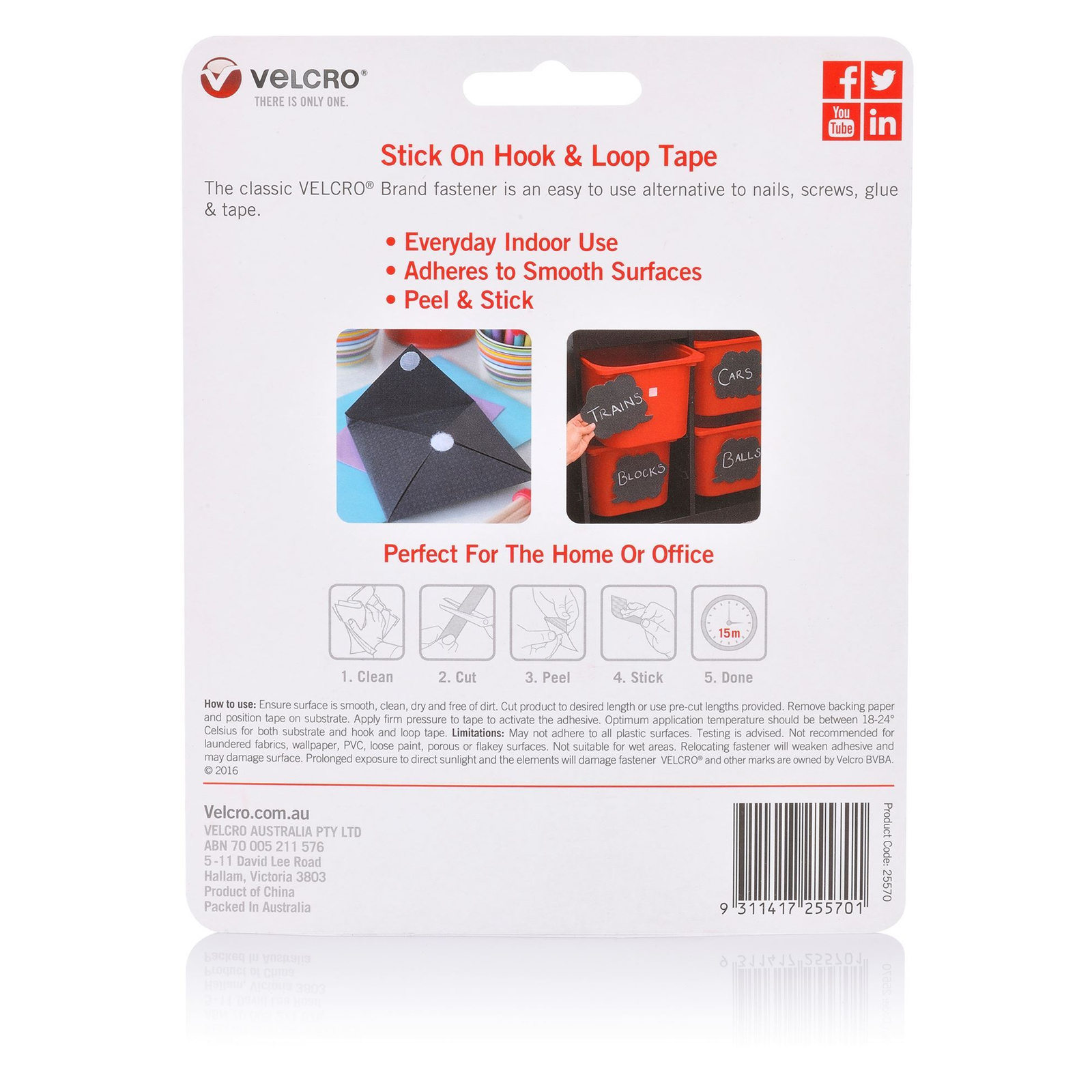 VELCRO® Brand Stick On Tape is ideal for hanging and attaching items at home, work and in the classroom. Display posters, signs, prints, artwork and more, quickly and easily without the mess of glue or the hassle of nails and tacks. Can be cut to size to suit the requirements of your task. Suitable for use on most smooth indoor surfaces including wood, metal, glass, cardboard and plastic.