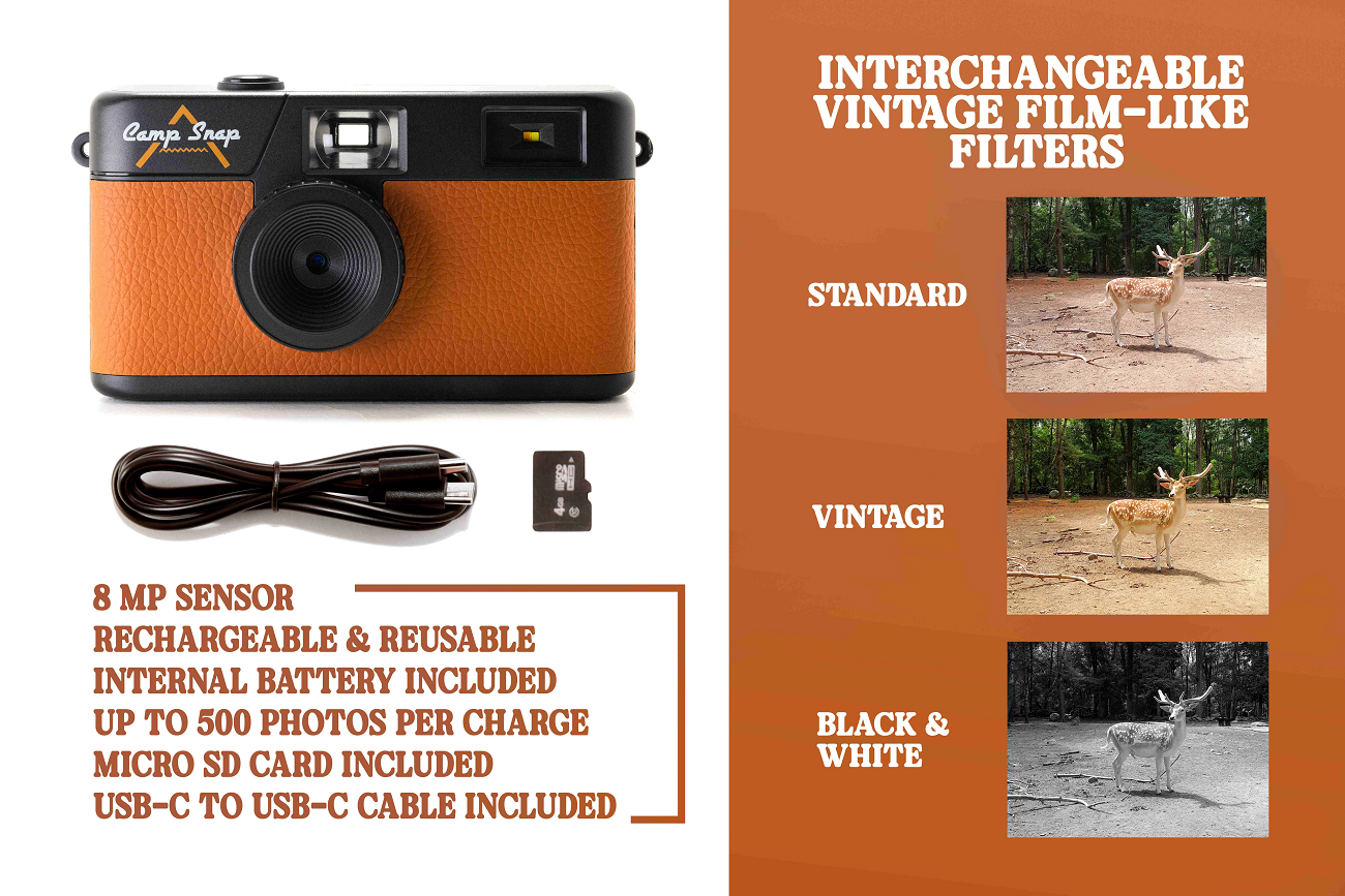 - Snap More, Charge Less: Enjoy hours of photo-taking on one charge! The Camp Snap's built-in Li-ion battery powers up to 500 shots, making it ideal for trips, parties, and everyday moments.