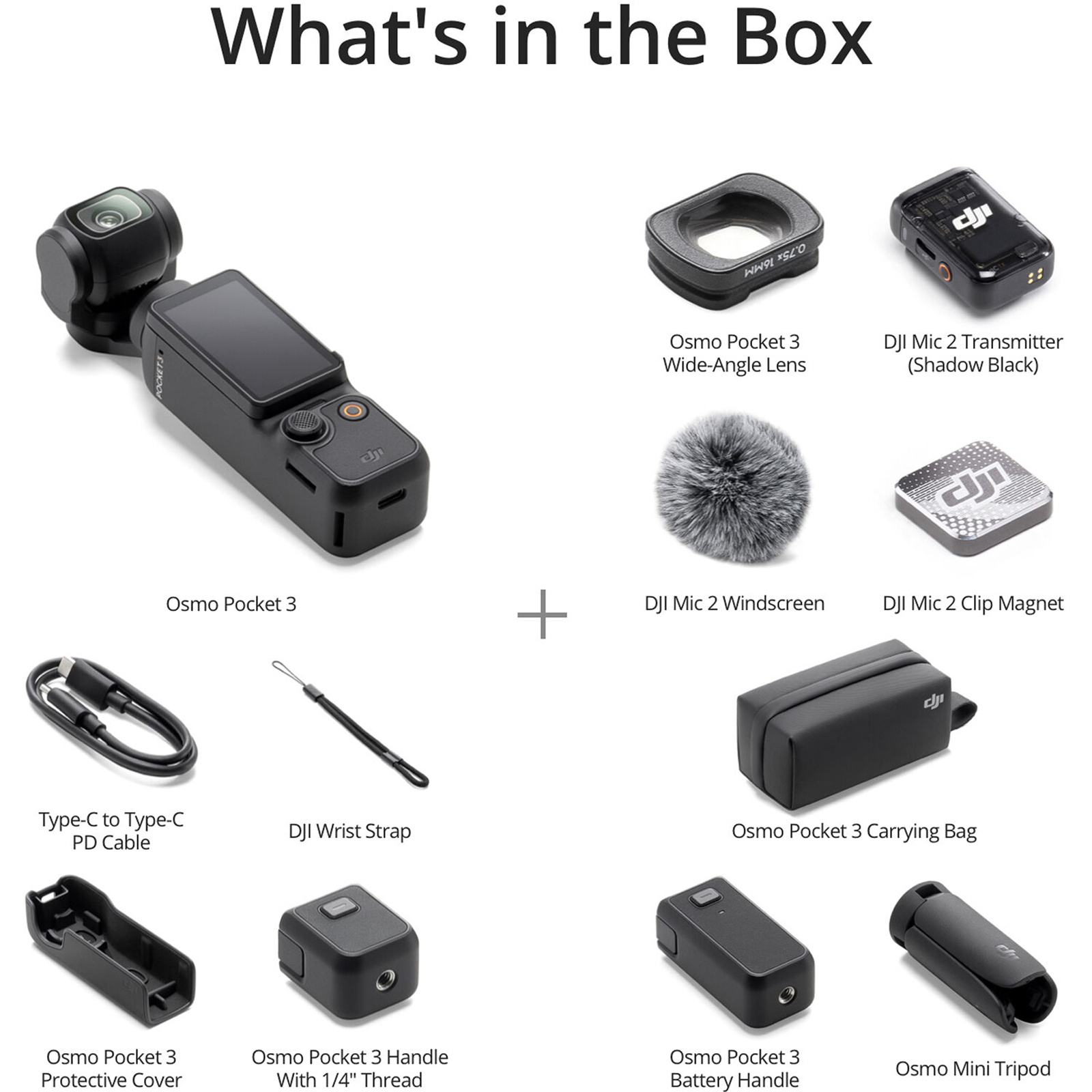 The Osmo Pocket 3 Creator Combo from DJI is a comprehensive mobile and studio production kit that includes everything you need to capture stable and smooth motion video and sound. The versatile system includes the DJI Osmo Pocket 3 with accessories, including a wide-angle lens, a battery handle with an integrated rechargeable 950mAh battery, a mini tripod, a DJI Mic 2 transmitter, a windscreen, and a clip magnet for proper, professional audio acquisition. Everything can be stored and transported to and from location with the included Osmo Pocket 3 carrying bag.