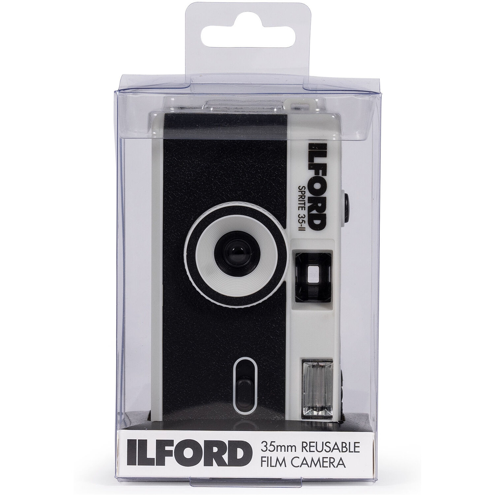 Offered here in black and silver, the Sprite 35-II Film Camera from Ilford is a basic and easy-to-use film camera for general use. The camera has a fixed-focus wide-angle lens, perfect for capturing most well-focused daylight scenes, and the camera also features a built-in flash with a 15 second recycle time for night time shooting. Compatible with 35mm color negative or black and white film, the Sprite-II allows you to capture quick snapshots or moody monochrome scenes. Designed for simple operation, the camera has a manual film advance winding lever to move through each exposure and rewind the roll when the film is finished.