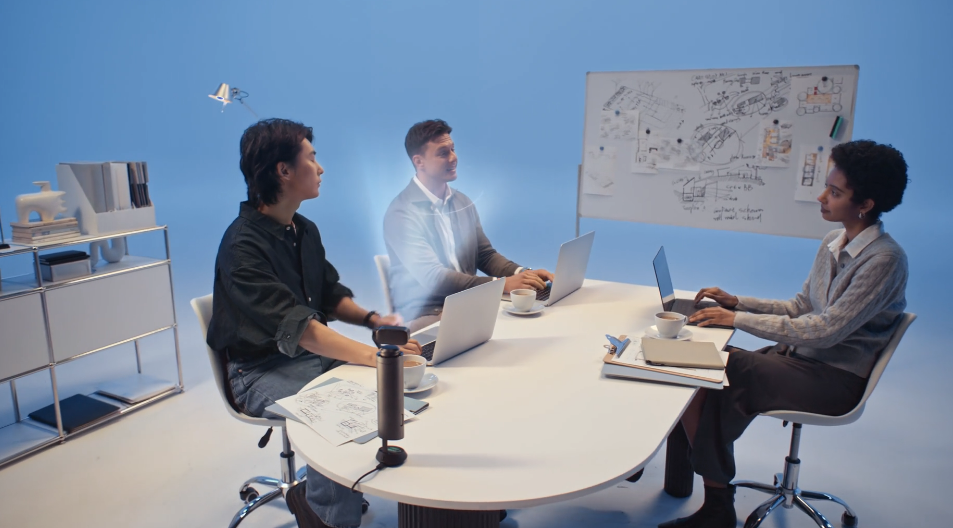 Tilt down to share your workspace in real time. Ideal for showing sketches, documents, or demos with total ease.