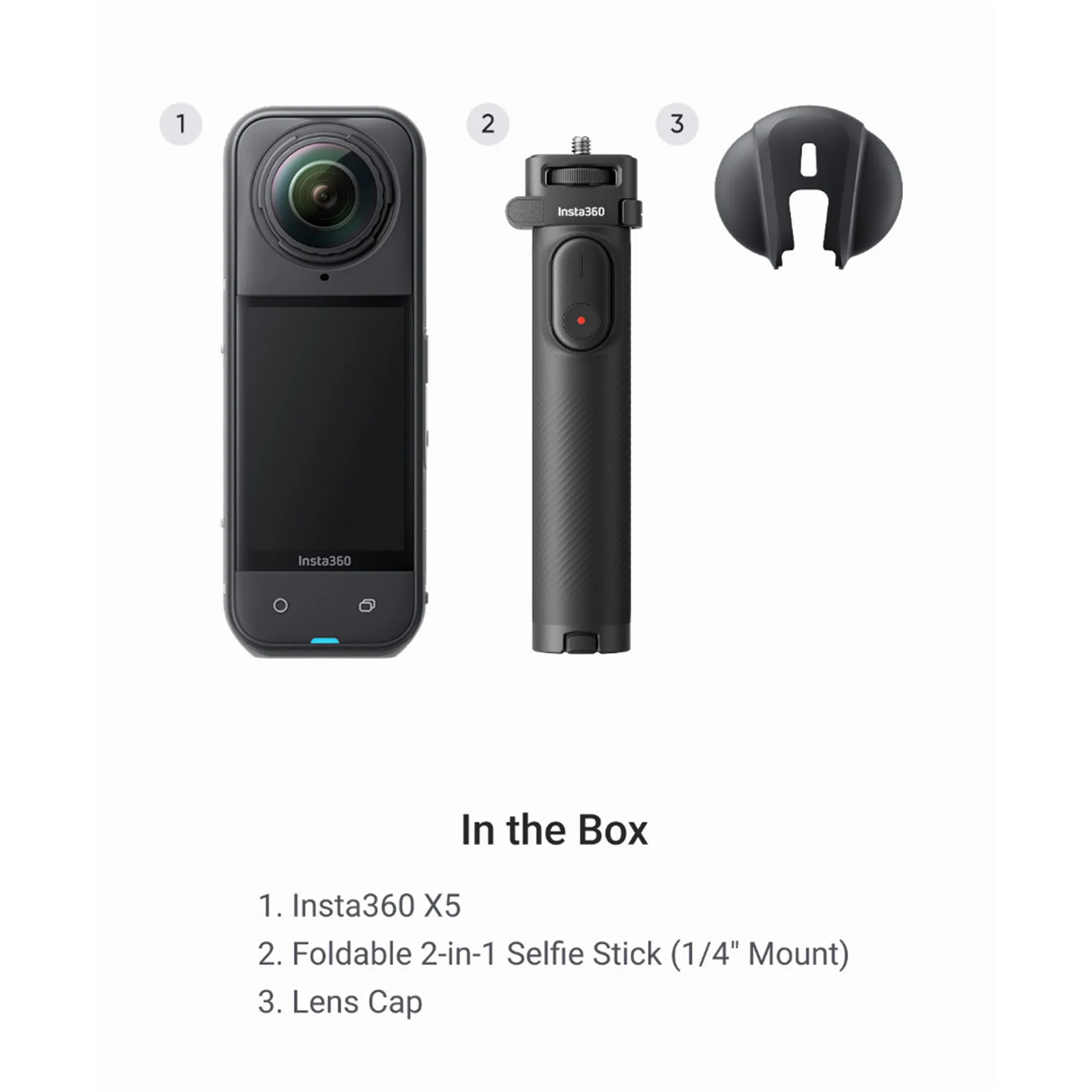 Includes 1x Insta360 X5 - 1x Lens Cap - 1x Foldable 2-in-1 Selfie Stick (1/4" Mount)