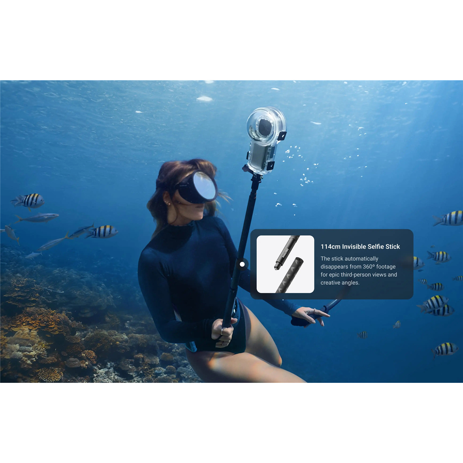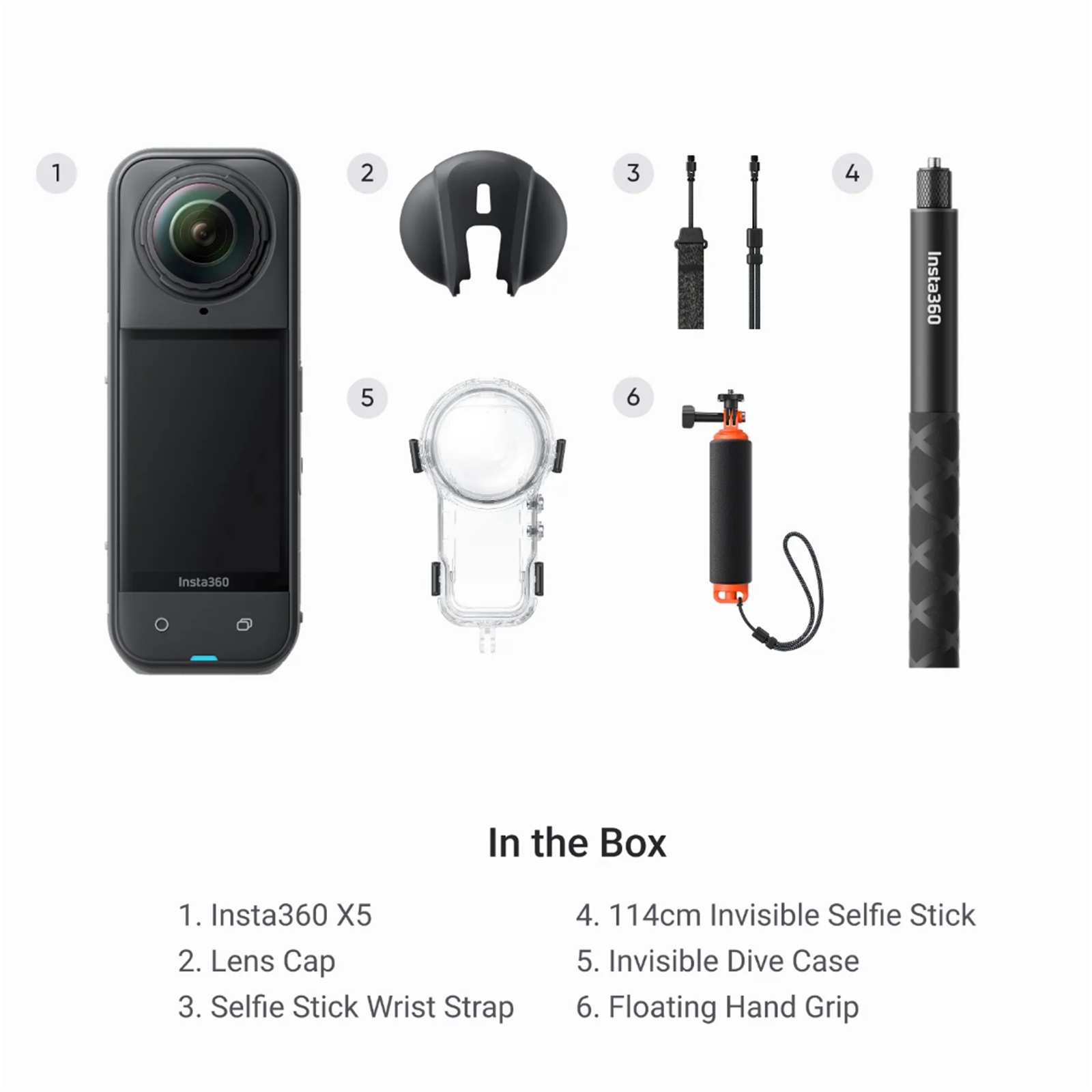 - Includes 1 x Insta360 X5, 1 x Lens Cap, 1 x 114cm Invisible Selfie Stick, 1 x Invisble Dive Case, 1 x Floating Hand Grip and 1 x Selfie Stick Wrist Strap
