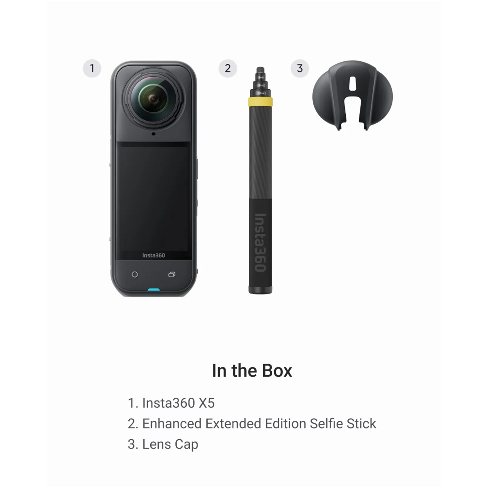 Includes 1x Insta360 X5 - 1x Lens Cap - 1x Enhanced Extended Edition Selfie Stick