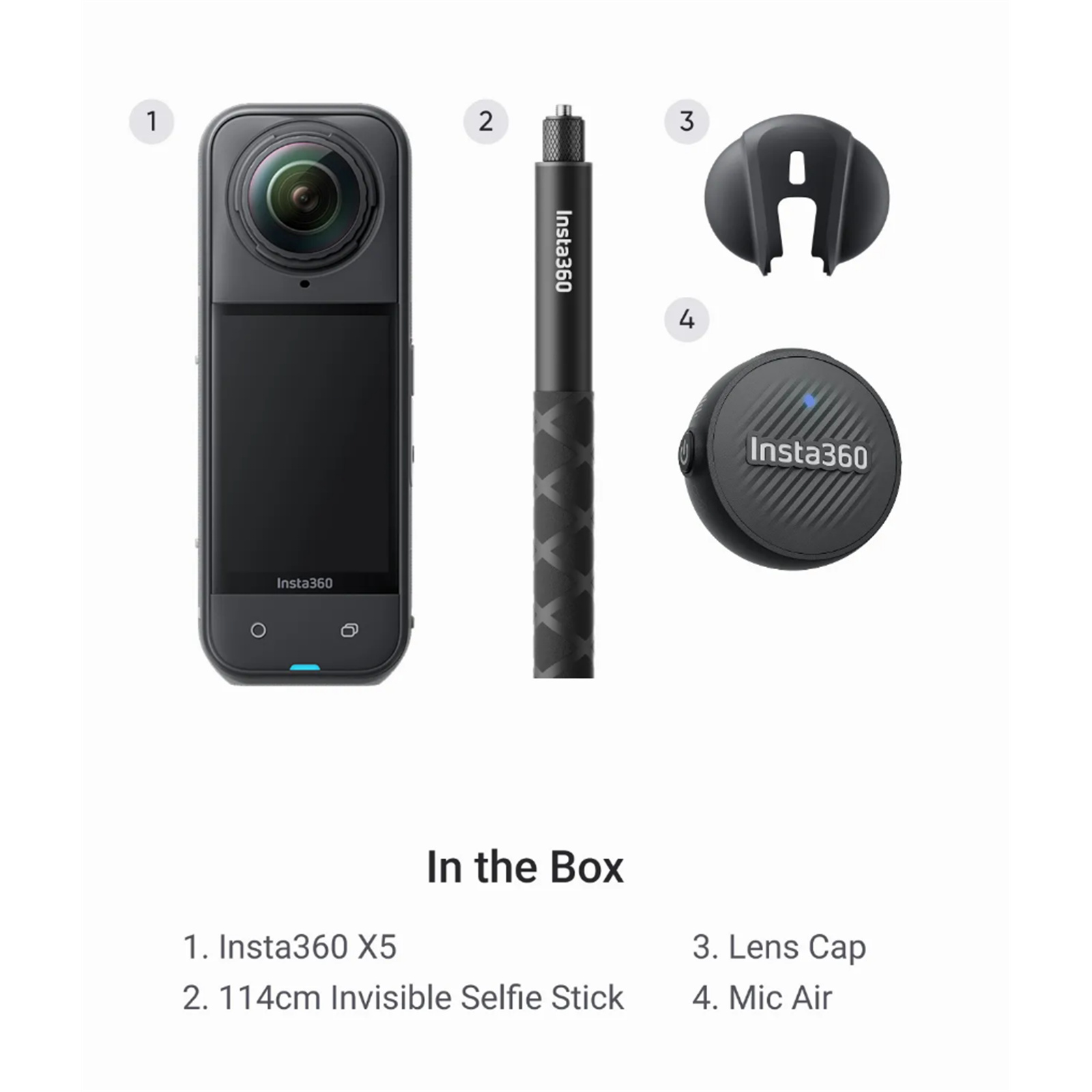 Insta360 X5 360° Waterproof 8K Action Camera Creator Bundle Includes 1x Insta360 X5 - 1x Lens Cap - 1x 114cm Invisible Selfie Stick - 1x Mic Air