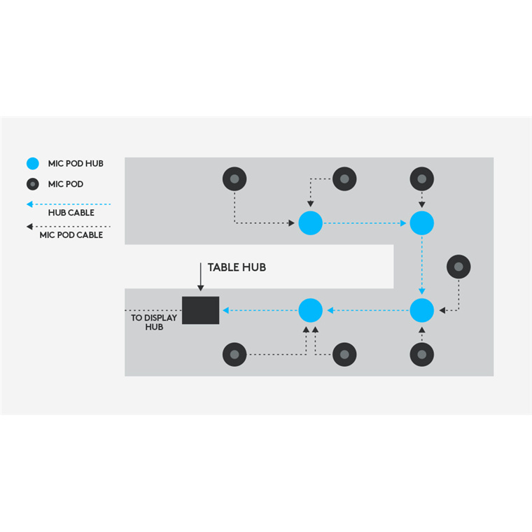 Eliminate cross-table cabling between mic pods by connecting them through grommets to hubs beneath the table. This keeps audio cabling out of sight for a professional appearance.