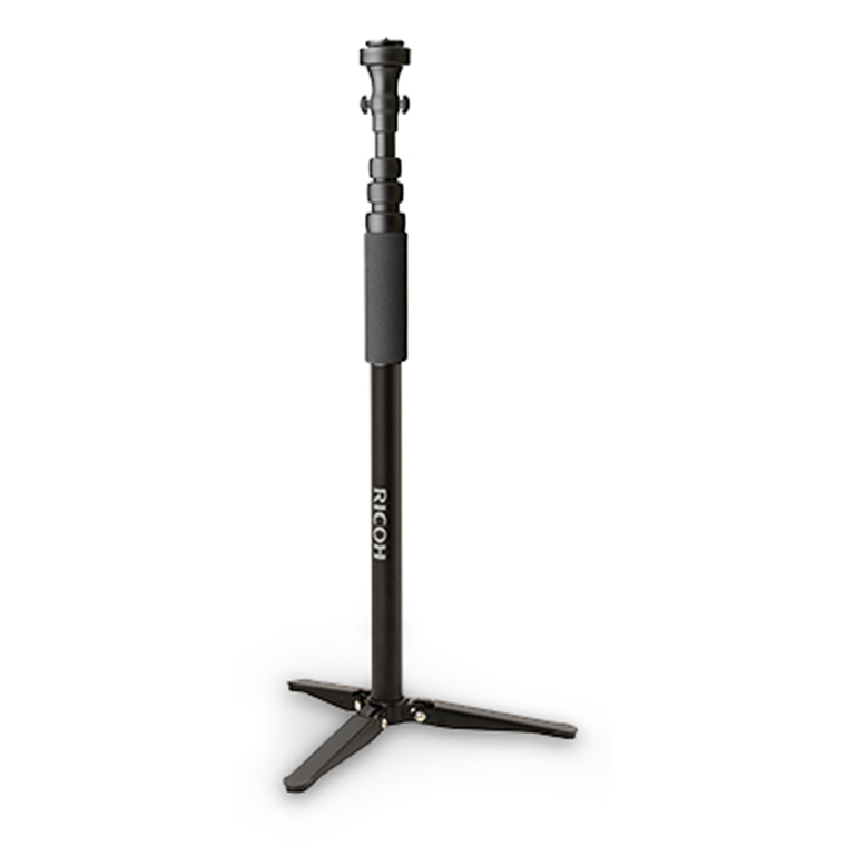 RICOH THETA series dedicated monopod. The camera platform and leg are reduced in size to prevent them from appearing in a RICOH THETA's image, and a quick-release system is adopted for the camera platform. The length when stowed is 53.5 cm, and it can be extended up to 150 cm with a single touch of a button.