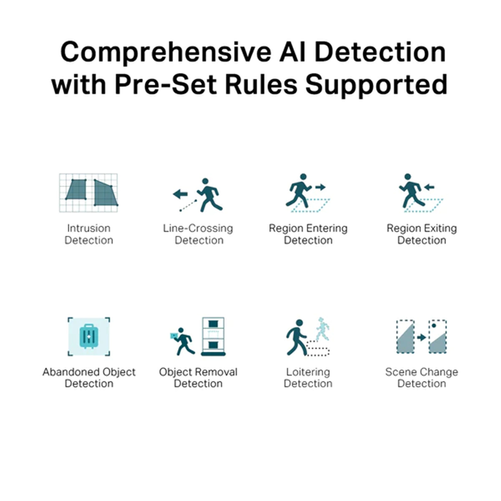 Human & Vehicle Classification, Area Intrusion Detection, Line-Crossing Detection, People Detection, Vehicle Detection, Region Entering Detection, Region Exiting Detection, Object Abandoned Detection, Object Removal Detection, Loitering Detection, Scene Change Detection