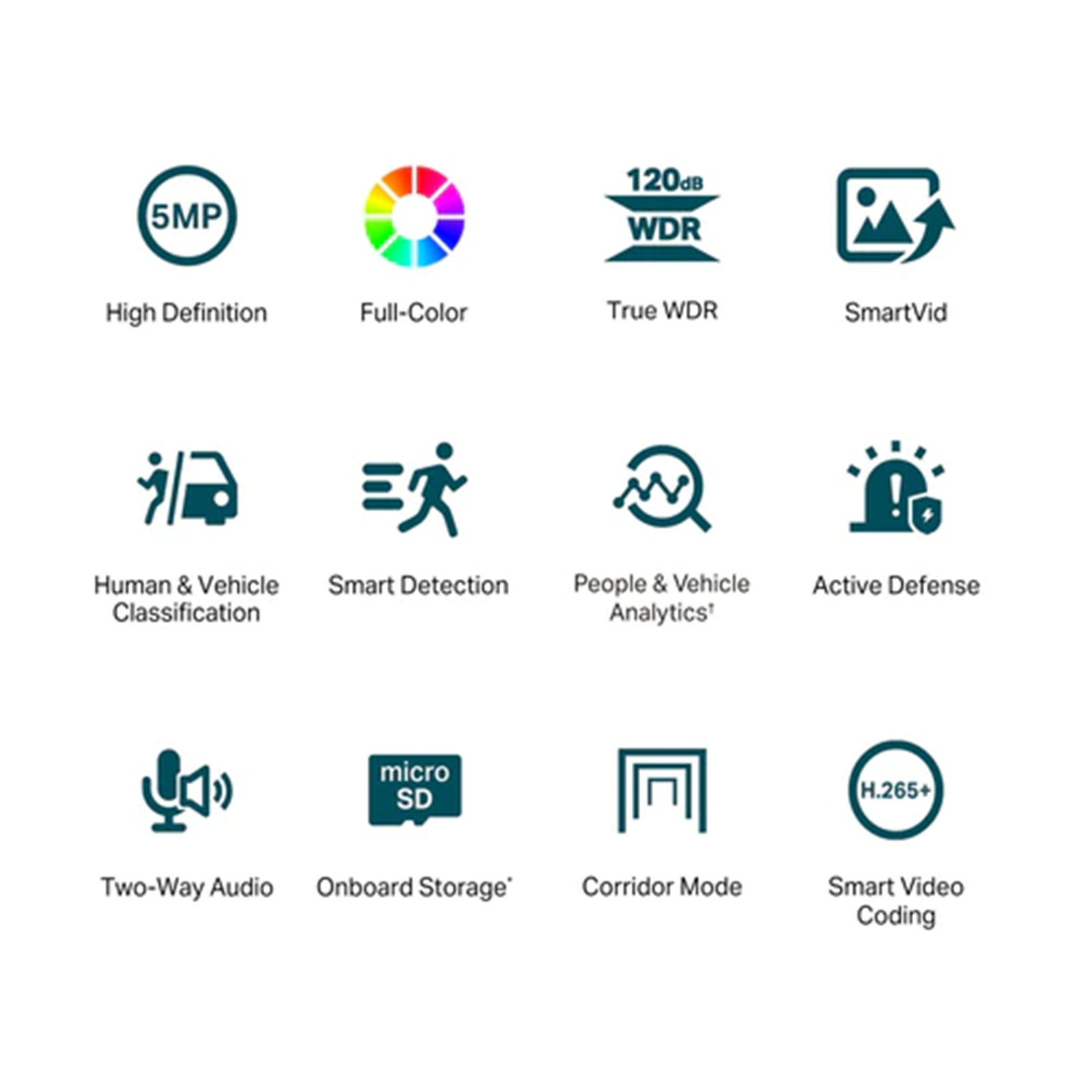 Monitor 24-hour clear and colourful details even on pitch night. VIGI Full-Colour camera provides maximum 5MP resolutions and ensures colourful monitoring with its large-aperture lens, high-sensitivity sensor, and attached supplemental lights.