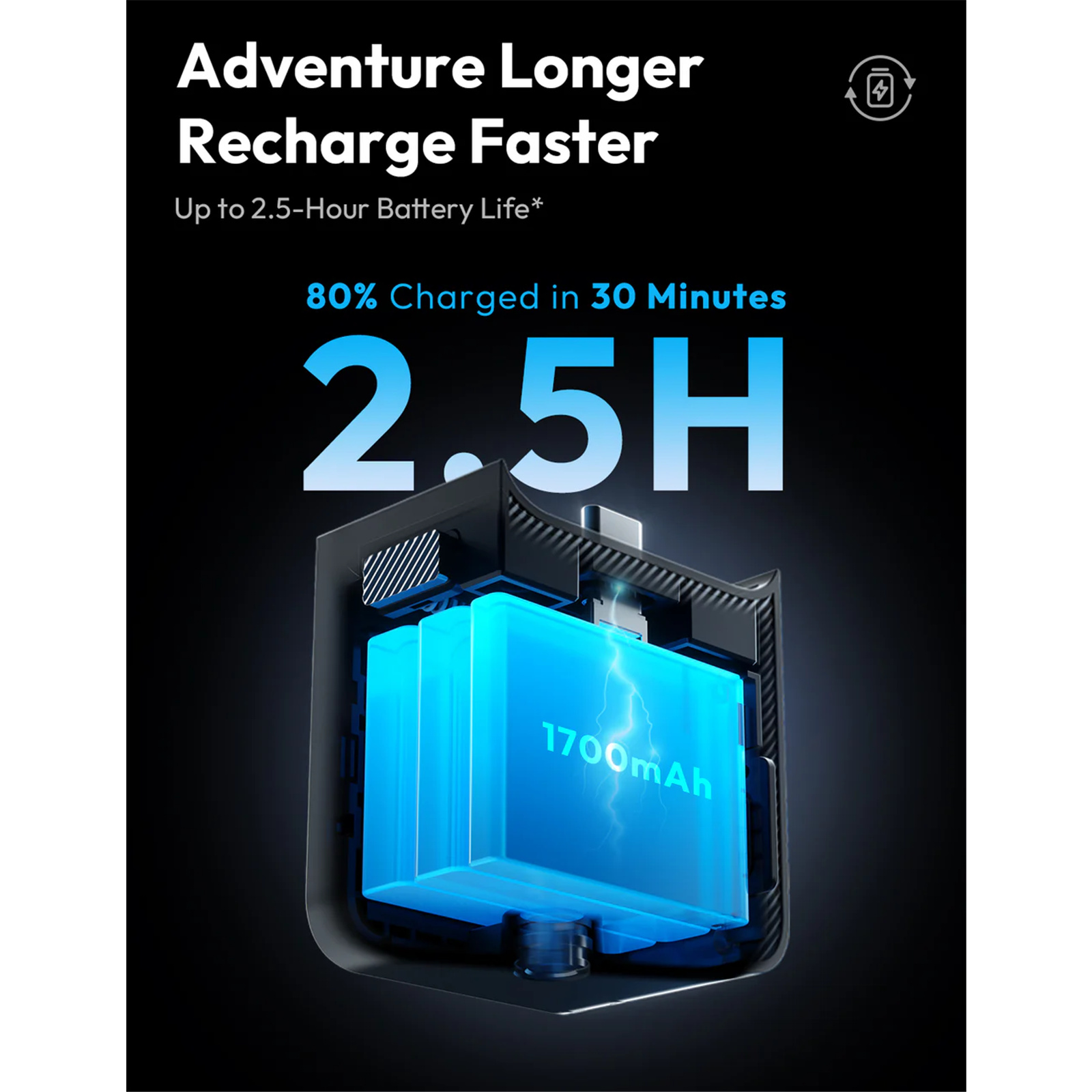 The powerful 1700 mAh battery allows recording for up to 2.5 hours on a single charge. The fast-charging function allows it to reach 80% charge in just 30 minutes. The video recorder is rain- and splash-proof, so you can use it while hiking, trekking or biking in the rain.