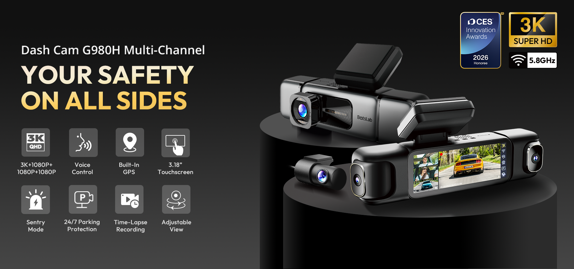 BOTSLAB G980H 3K 4 Channel Dash Cam, 3K Front and 1080p*3 Car Camera Left Right Inside, 560° Dash Cam for Car, Built-in 5.8GHz WiFi and GPS, Voice Control, Included 128GB SD Card
