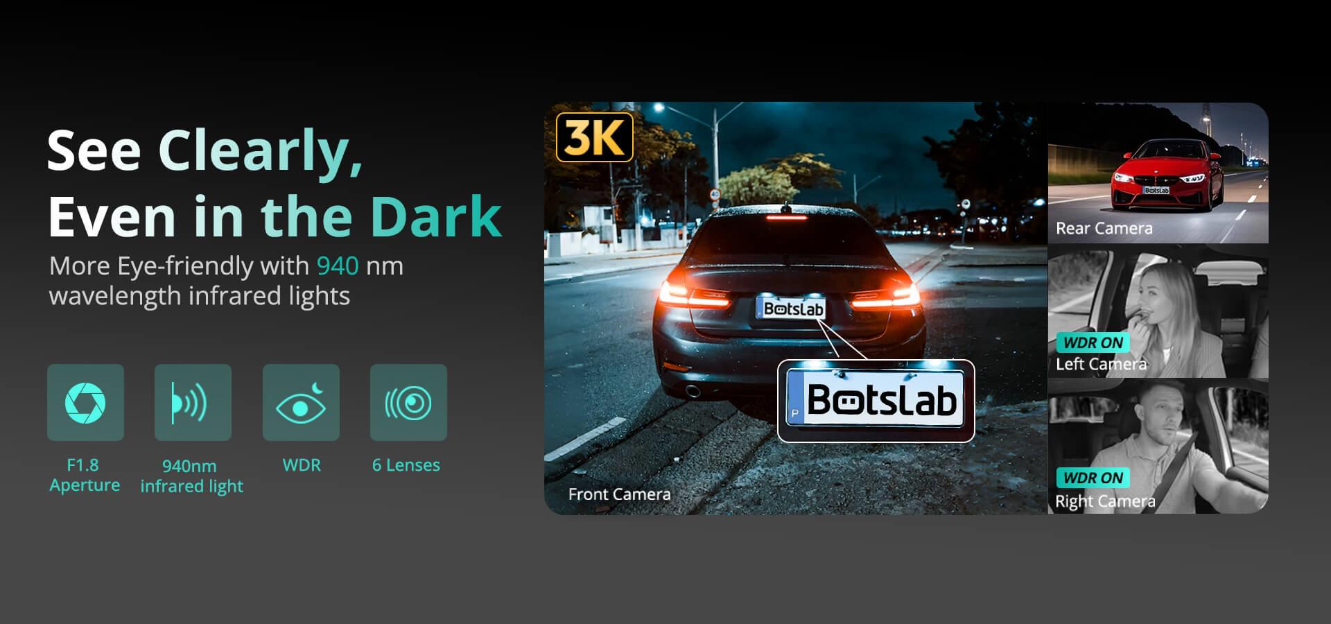 The Botslab G980H Pro 4CH takes great pictures using Sony image sensors. These super powerful sensors guarantee the sharpest images and are unmatched, especially in the dark. The videos are recorded in 3K resolution at the front and FullHD for the interior and rear.