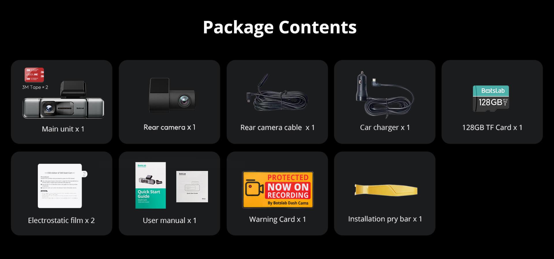 This G980H Pro 4CH comes with a 128GB Micro SD card, good for approximately 8 hours of 3K + 3x FullHD recordings. It supports Micro SD cards up to 256GB, which allows for approximately 16 hours of storage.