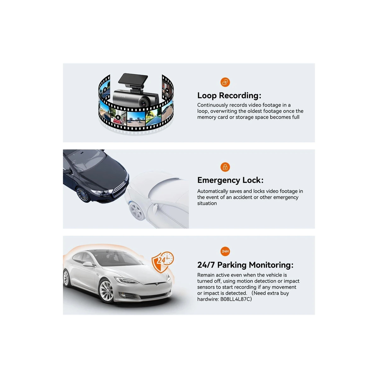 *DDPai Official Hardwire Kit is required for the 24 hour recording feature.