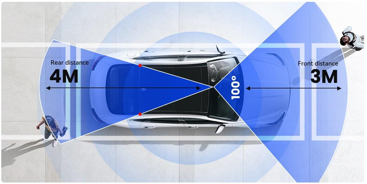 The AI millimeter-wave radar monitors vehicle's surroundings. Upon detection, the camera automatically records, saving 10 seconds of video.