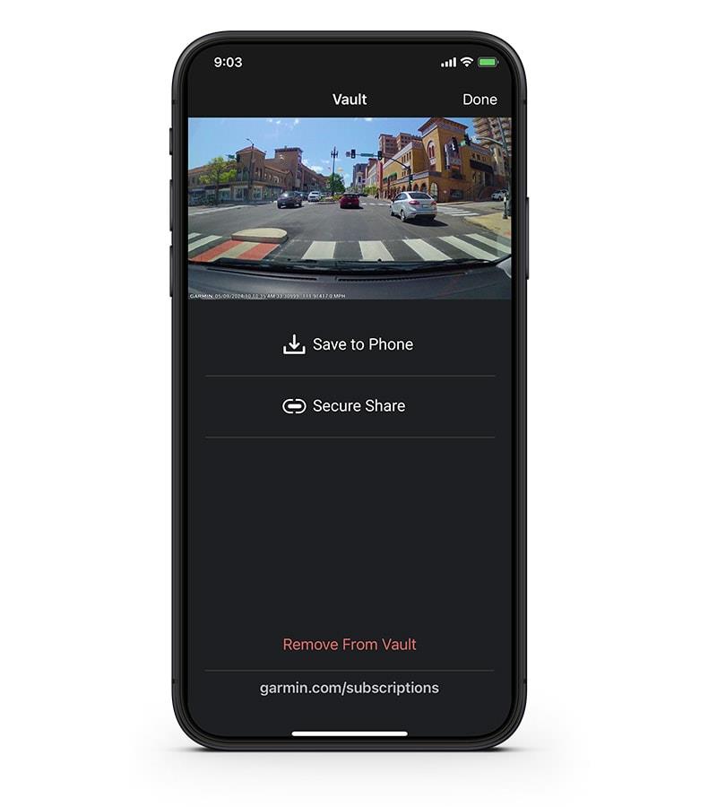 The Vault makes it easy to securely share your important videos. With a paid Vault subscription and Wi-Fi® connectivity, saved video clips are accessible by using the Garmin Drive app on your compatible smartphone.