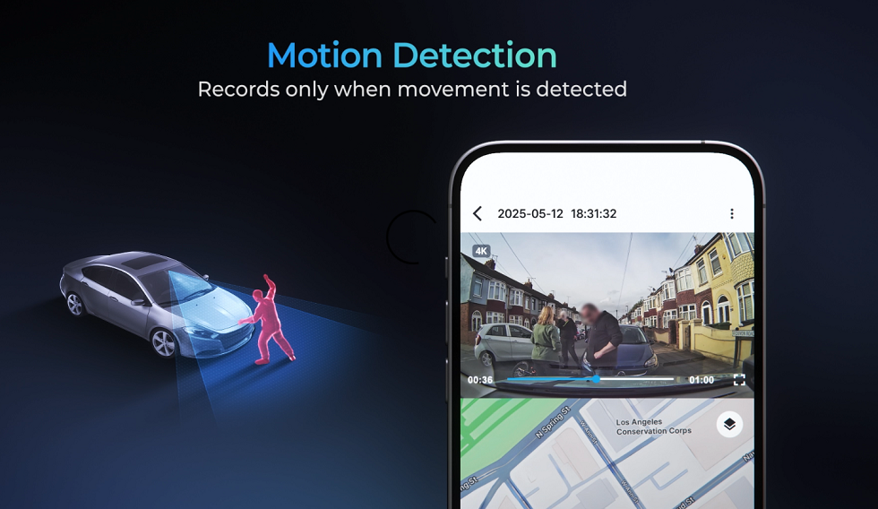 Records a 1-minute buffered video whenever a motion is detected by the front or rear camera. Motion detection areas can be set manually in the app.