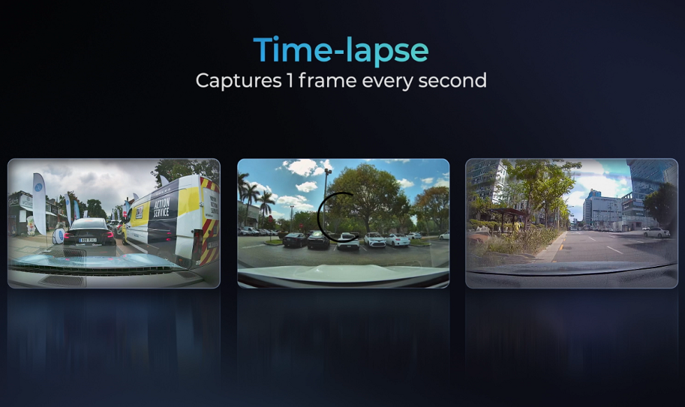 Records constantly at 1 frame per second so each 1 minute video covers 30 minutes of real time. Recommended if you routinely park in busy areas.
