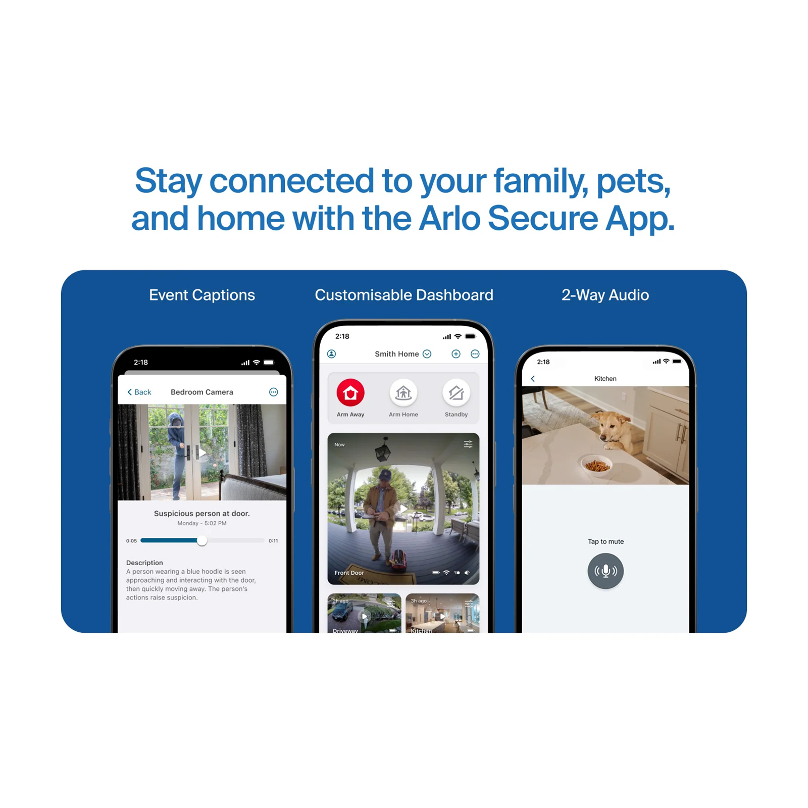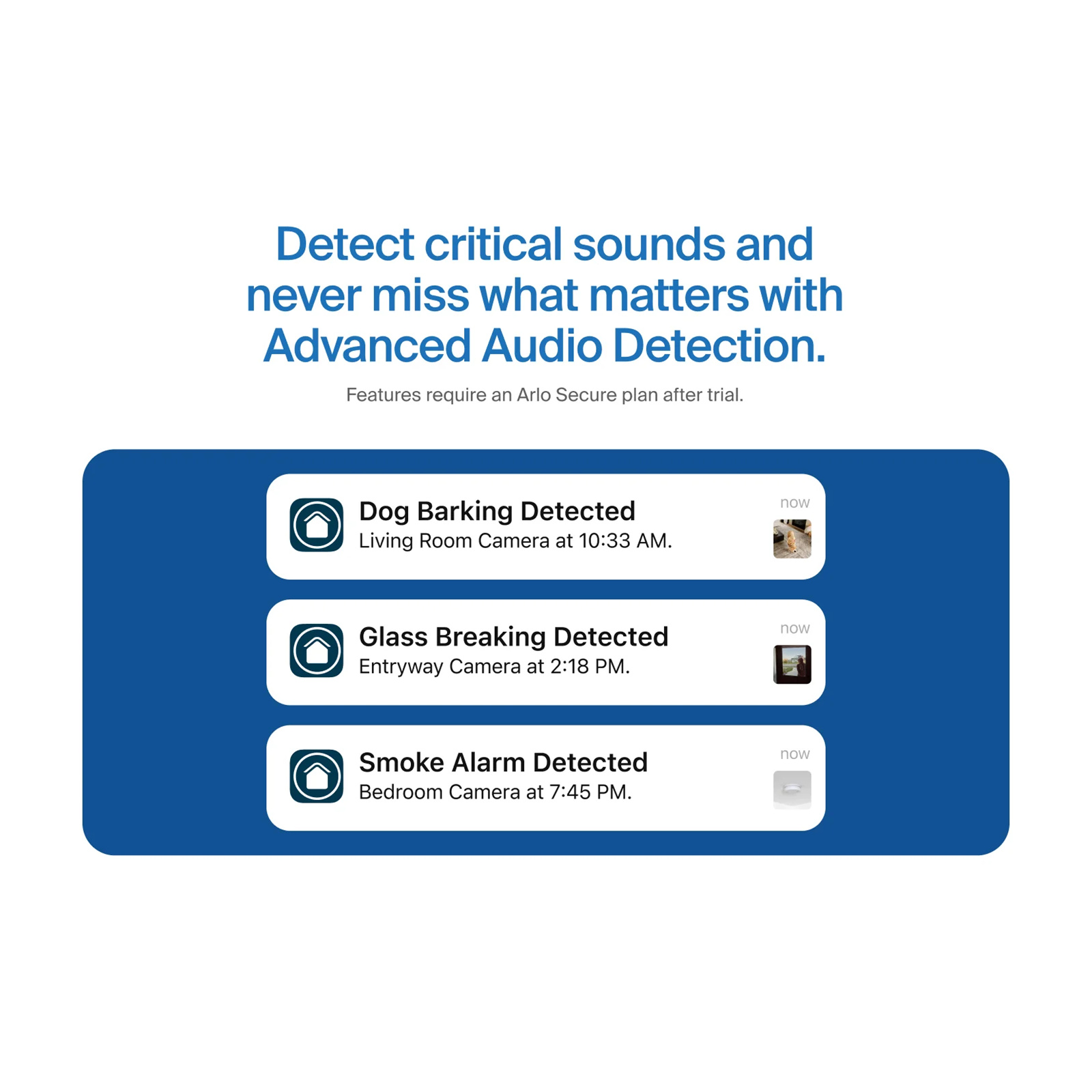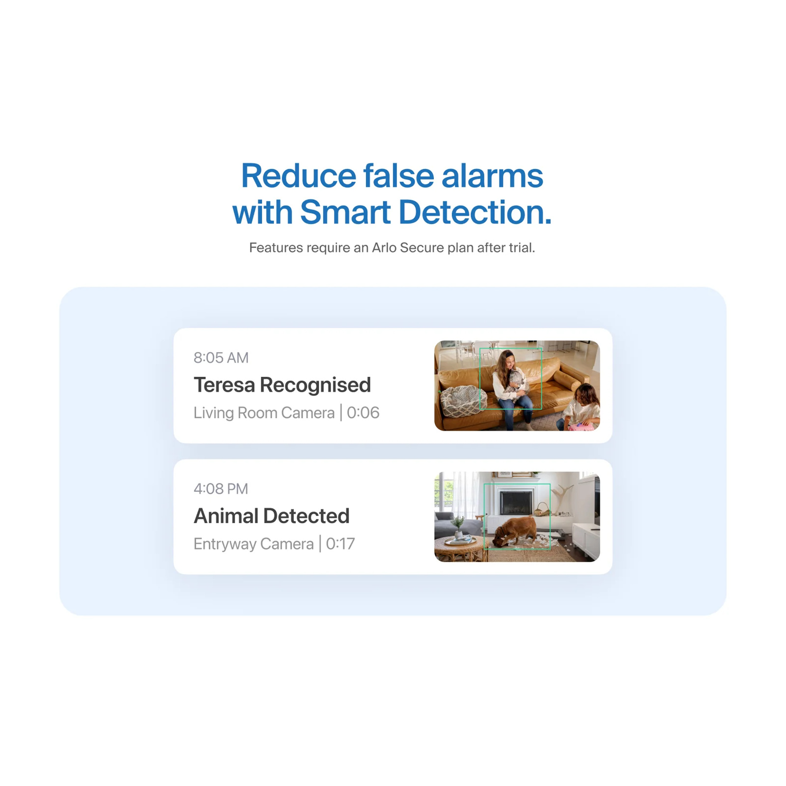 We continually innovate and elevate your protection with Arlo Secure plans built with AI-powered features that deliver precise alerts with key information. You'll have complete awareness of what's happening on your property and be able to make critical security decisions immediately.