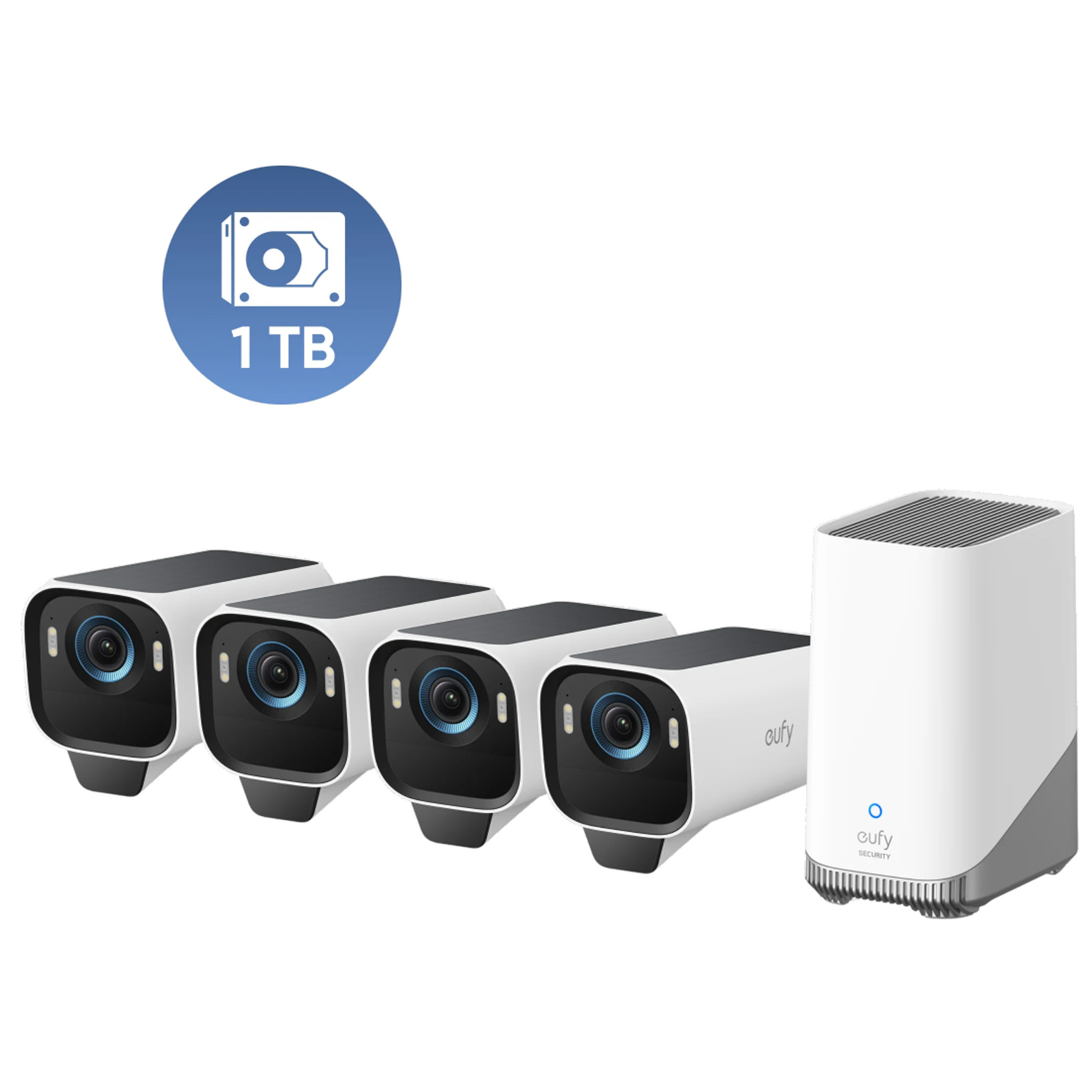 Eufy Security eufyCam S3 Pro 4K Outdoor Wire-Free Battery Solar Camera Kit - 4 Pack Homebase3 with 1TB Storage / 13,400 mAh Battery last up to 365 Days / Backup Solar Panel x2 / Radar + PIR Dual Detection / AI Recognition