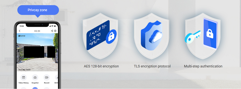 We design the H3 2K to respect every private space, and to secure every byte of your data. You can set up no-filming privacy zones on EZVIZ App to make sure recording only happens when it's appropriate and allowed. Meanwhile, your recordings is fully encrypted from end to end to stay private and secure.
