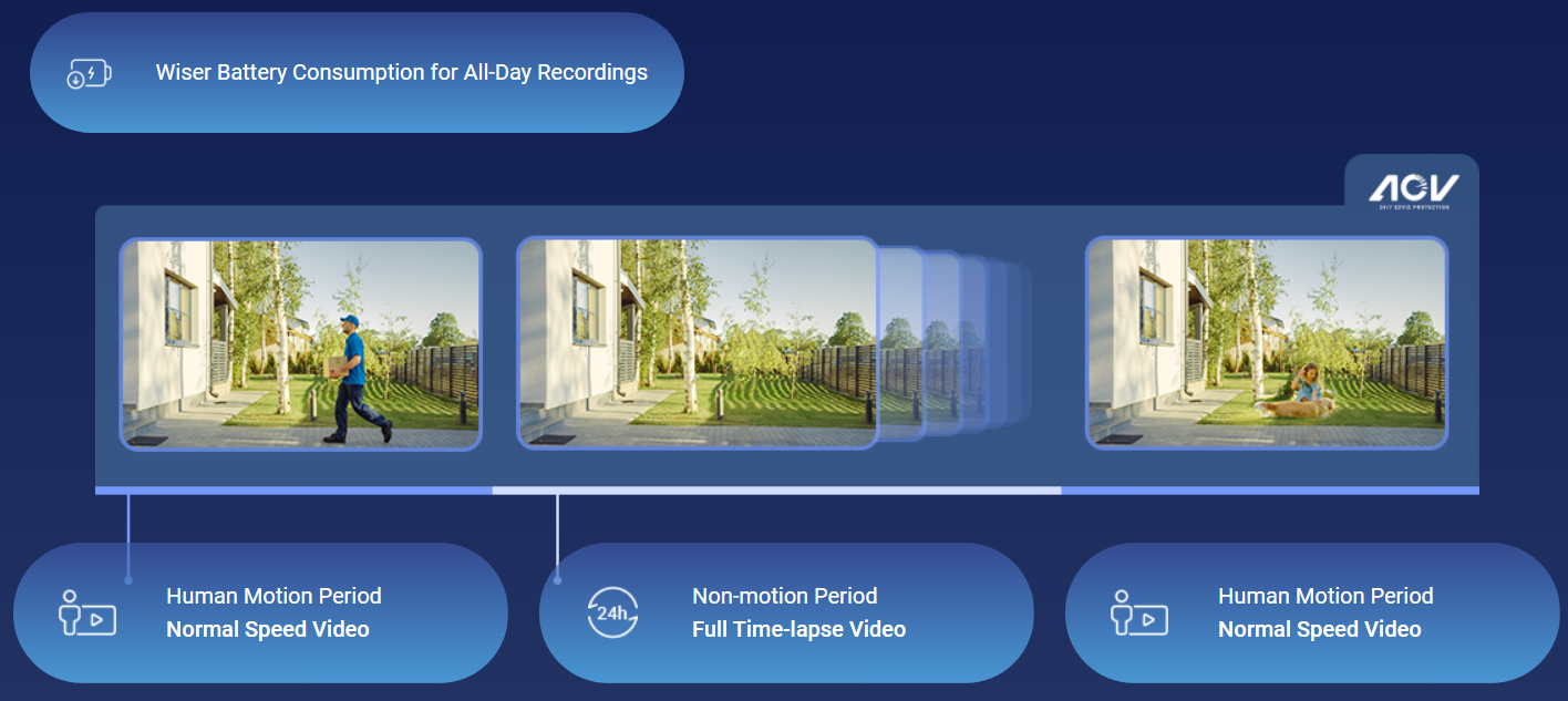 Want all-day recording video but worry about the battery will run out too quickly? Use the AOV mode. The CB5 can connect and process the images captured at preset time intervals to render a continuous time-lapse video that shows you changes in the environment.⁷ When an important human activity happens, the camera starts recording a normal video, so you don't miss an important detail.