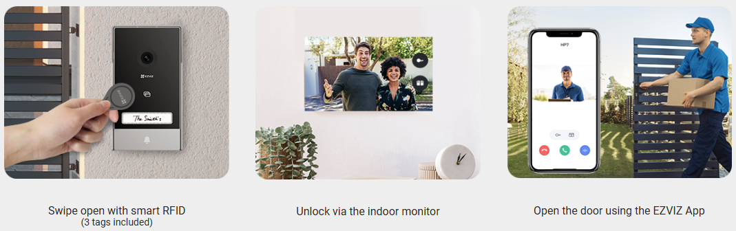 1.RFID badge unlock (Badges × 3 pcs) 2.App remote unlock 3.Indoor display unlock