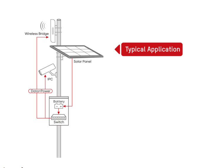 - Support 24 V passive PoE output for wireless bridge, etc.
