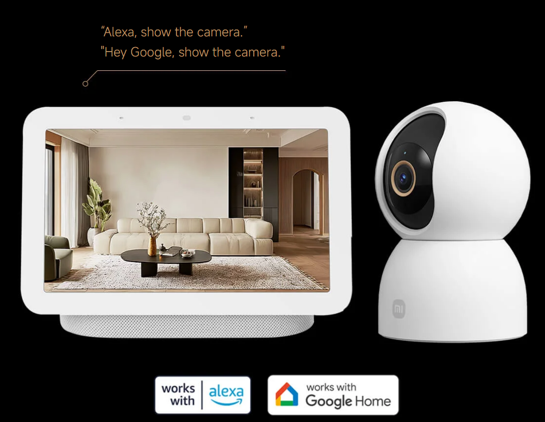 The camera can be linked to your Amazon Alexa and Google smart display*, allowing you to view surveillance footage directly on your device. You can also turn the camera on and off using voice commands.