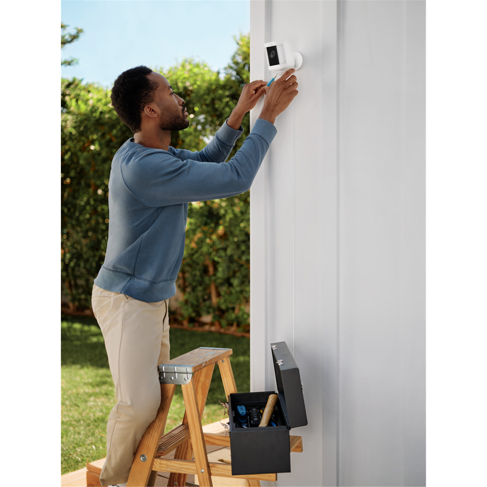 - Stop intruders in their tracks with spotlights that turn on whenever they detect motion and adjust the brightness to suit your surroundings. Sound the built-in security siren in a few taps to ward off unwanted visitors, right from the Ring app.