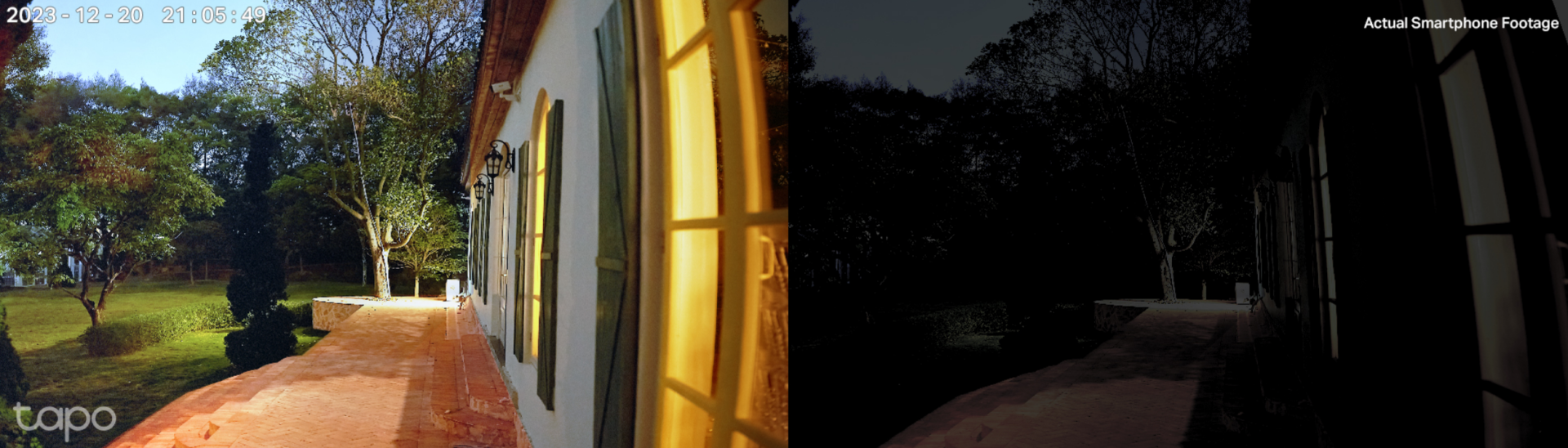 Tapo C325WB camera captures vibrant colours in ultra-low light, providing daytime-like clarity. It's crucial for accurately identifying details like faces and license plates, even in pitch-dark conditions. The IR mode will turn on when there is no light at all.