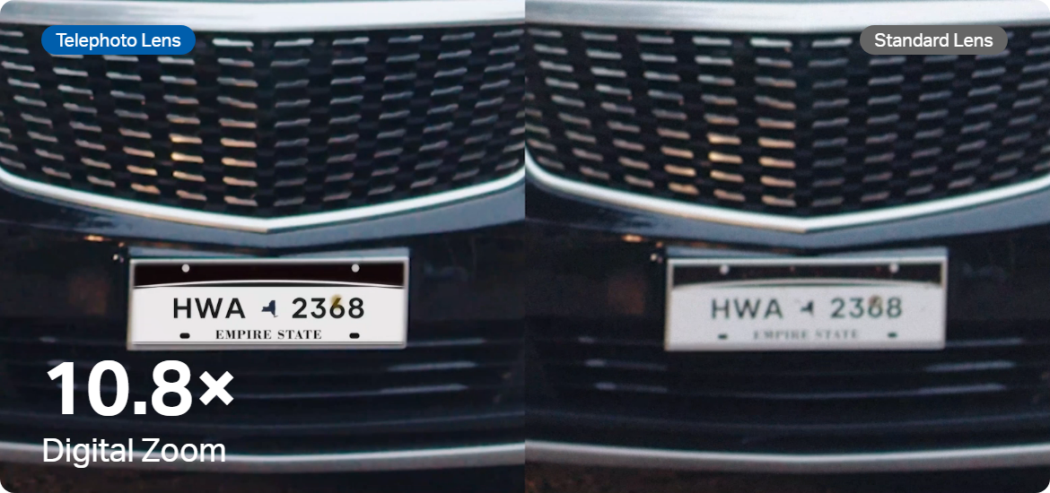 The 6mm telephoto lens delivers 3x clarity compared to standard lens and supports up to 10.8× digital zoom, ensuring every detail is clearly visible when you zoom in.