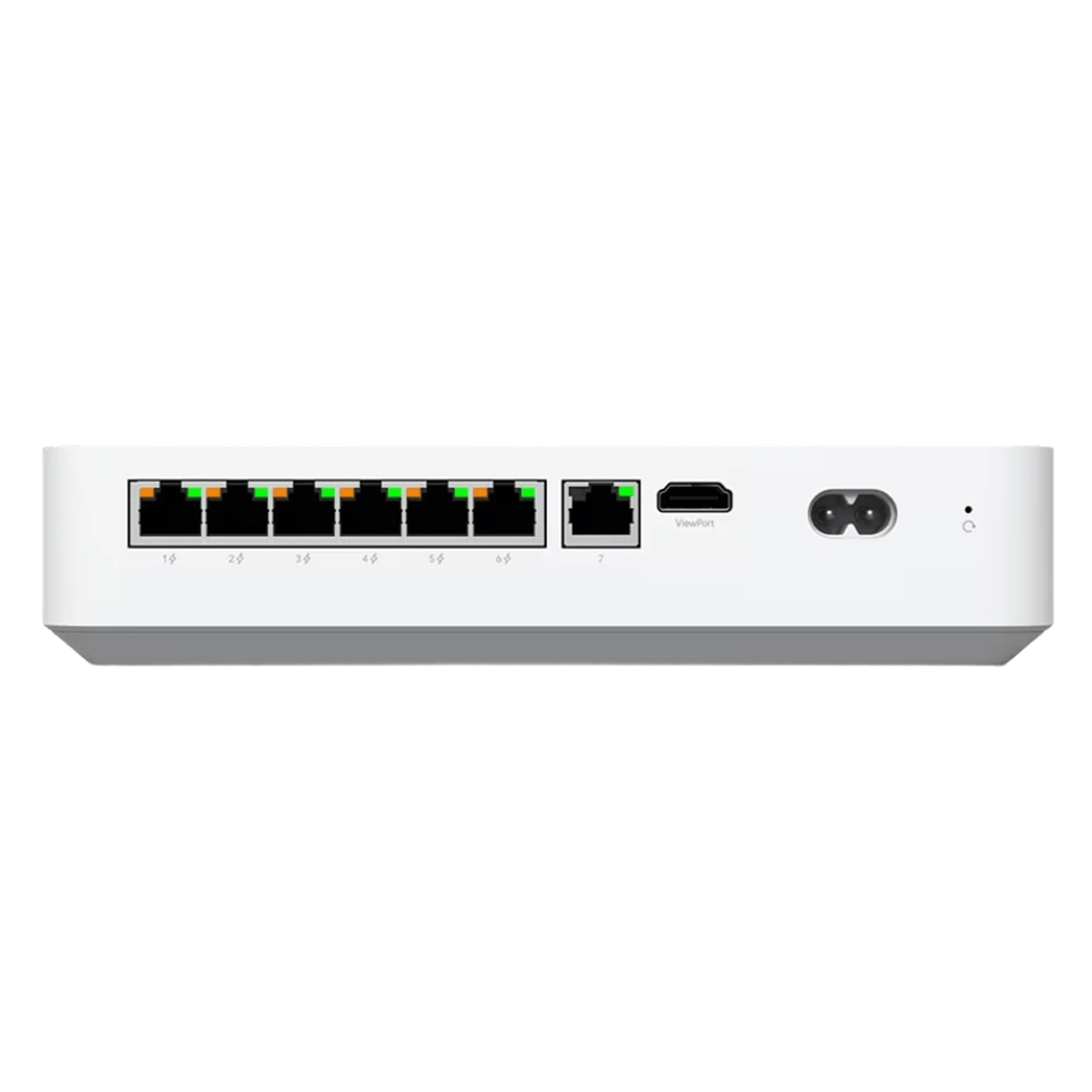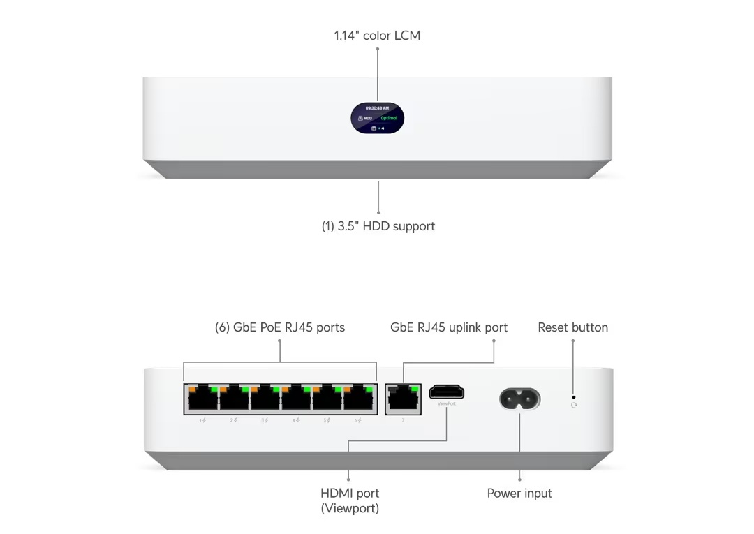 Compact UniFi Protect NVR with 3.5" HDD support, featuring an integrated 6-port PoE switch, integrated HDMI View Port, and a capacity for (6) 4K cameras or (15) Full HD cameras.