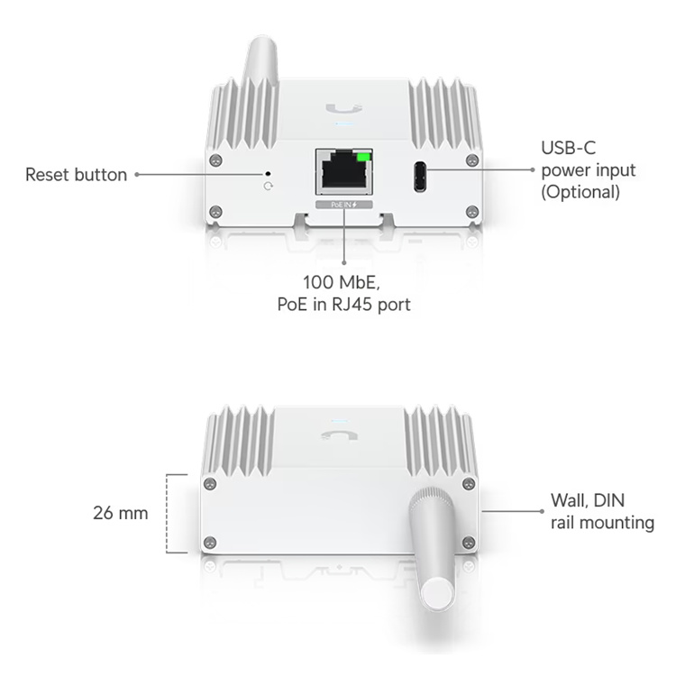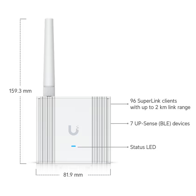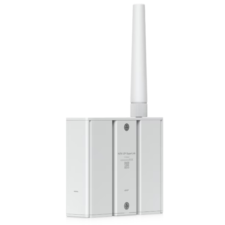 The UP-SuperLink is a proprietary, long-range, low-latency wireless gateway designed to extend connectivity across large areas for the upcoming UniFi Protect SuperLink Sensors. It supports both Bluetooth 5.2 and a custom sub-GHz SuperLink protocol, offering versatile, reliable sensor networking.