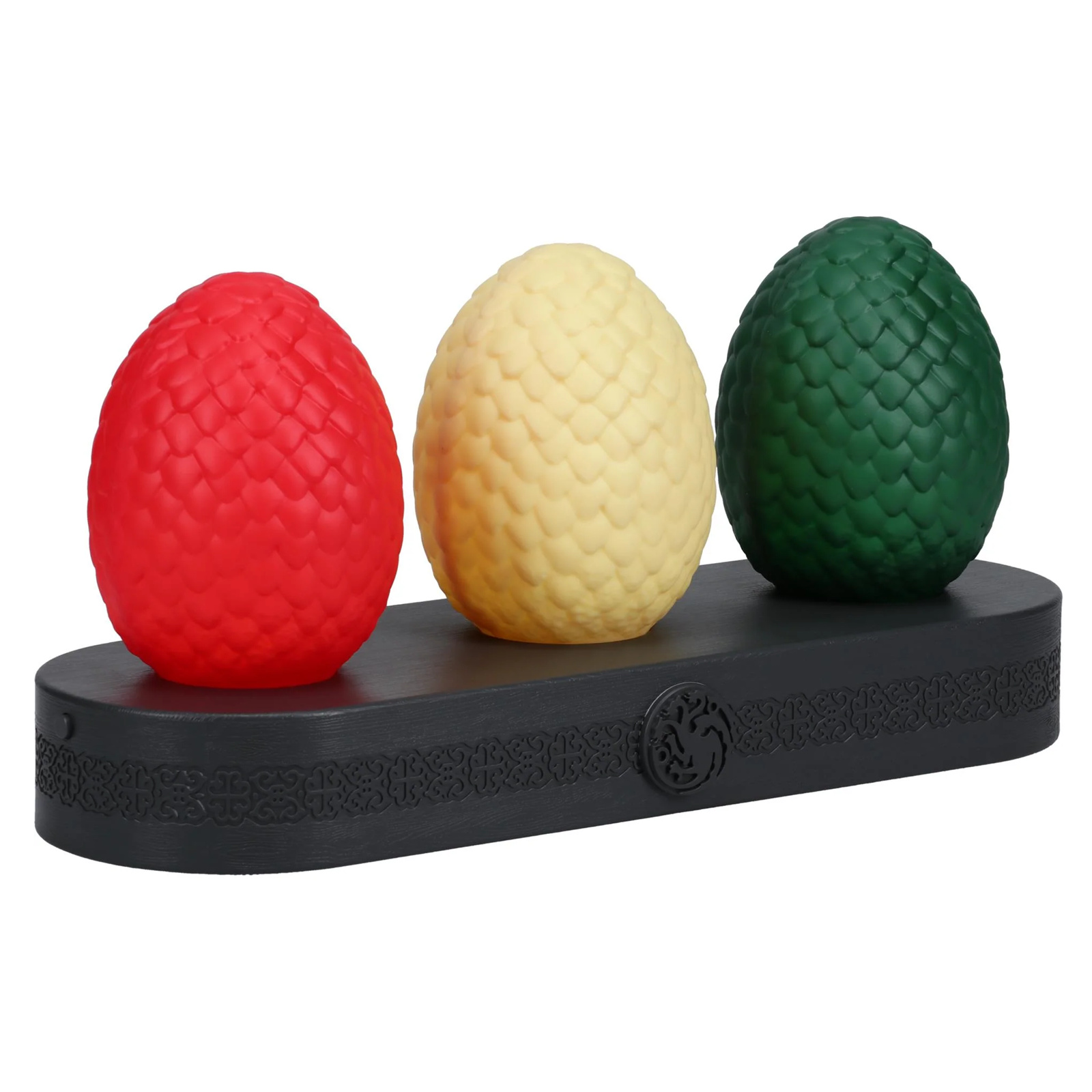 From HBO's House of the Dragon TV series comes this Dragon Egg light from Paladone Products. This House of the Dragon inspired egg light features 3 different coloured dragon eggs with light phasing. Don't miss out on adding this light to your House of the Dragon collection! The 30cm (11.8 inch) wide light includes three light modes - standard, phasing and music reactive. Shaped like three dragon eggs, it will bring a warm and soft glow into any room.