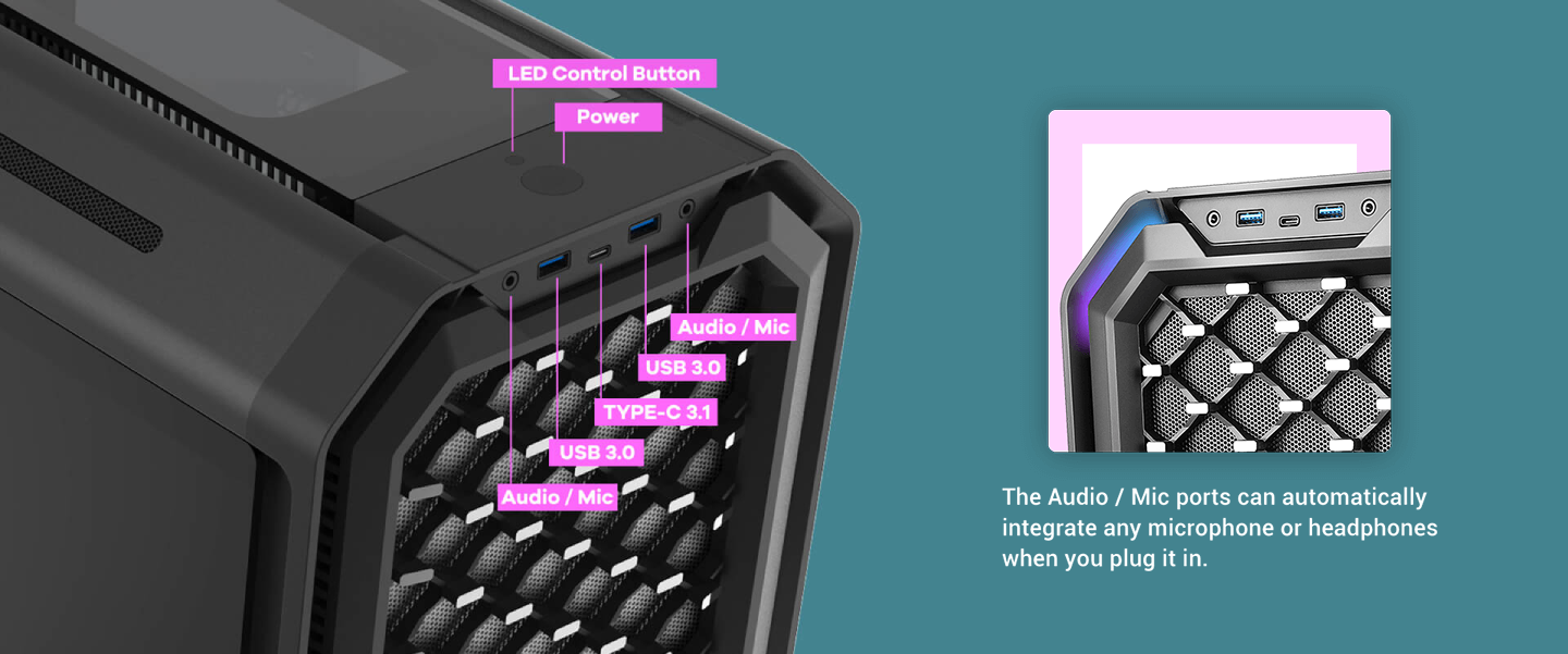 Power, LED Control Button, 2 x USB3.0, HD-AUDIO, TYPE-C3.1