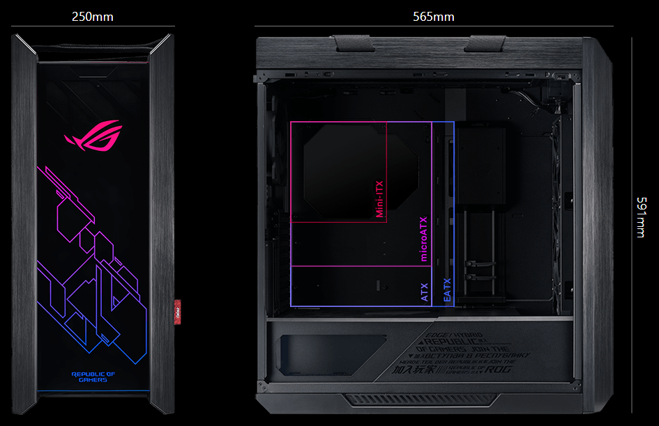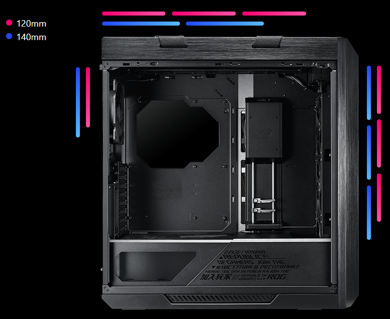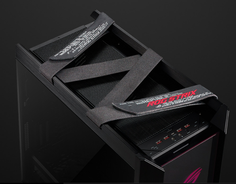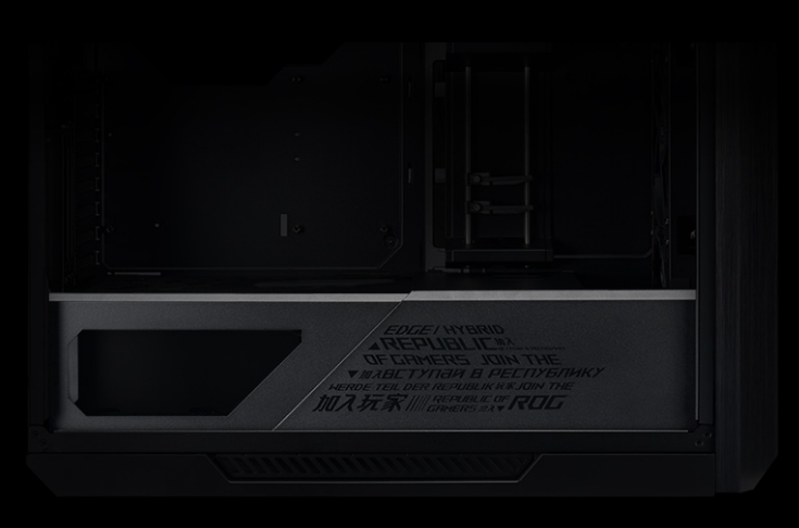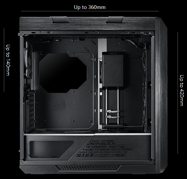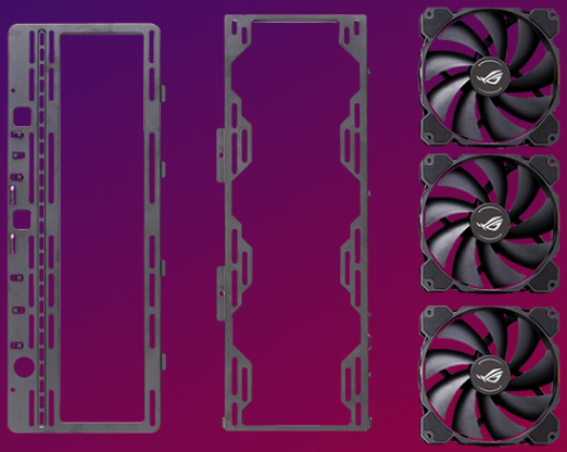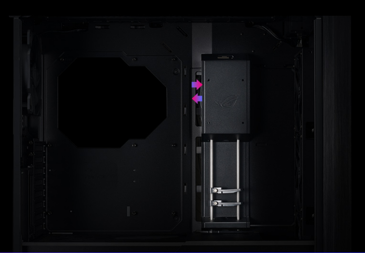 A multifunction cover with GPU braces cleverly hides cabling, provides sturdy support to graphics cards and allows for an SSD or ROG Aura Terminal to be mounted for display. Its position can be adjusted to accommodate an ATX or EATX motherboard.
