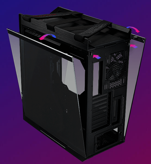 One push of the release buttons at the rear of the case lets you swing down the side panels for instant, tool-less access to the interior. The tempered-glass panels are bottom-hinged, meaning they will remain supported at an angle until you're ready to detach them completely.