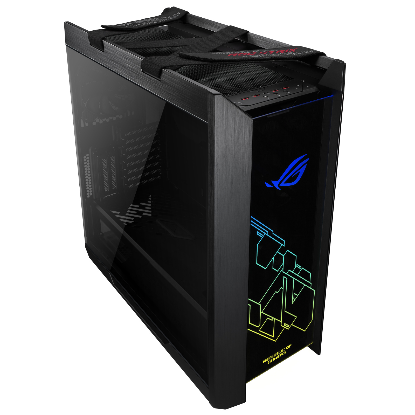 ROG Strix Helios is a premium mid-tower gaming case with three tempered-glass panels, refined aluminum frame and integrated front-panel RGB lighting. Built-in cable management, including a multifunction cover with GPU braces, keeps the interior sharp and tidy. Engineered for expandability and performance, it's ready for an up to EATX motherboard and serious water-cooling setups - making it the perfect choice for a classic ROG showcase build.