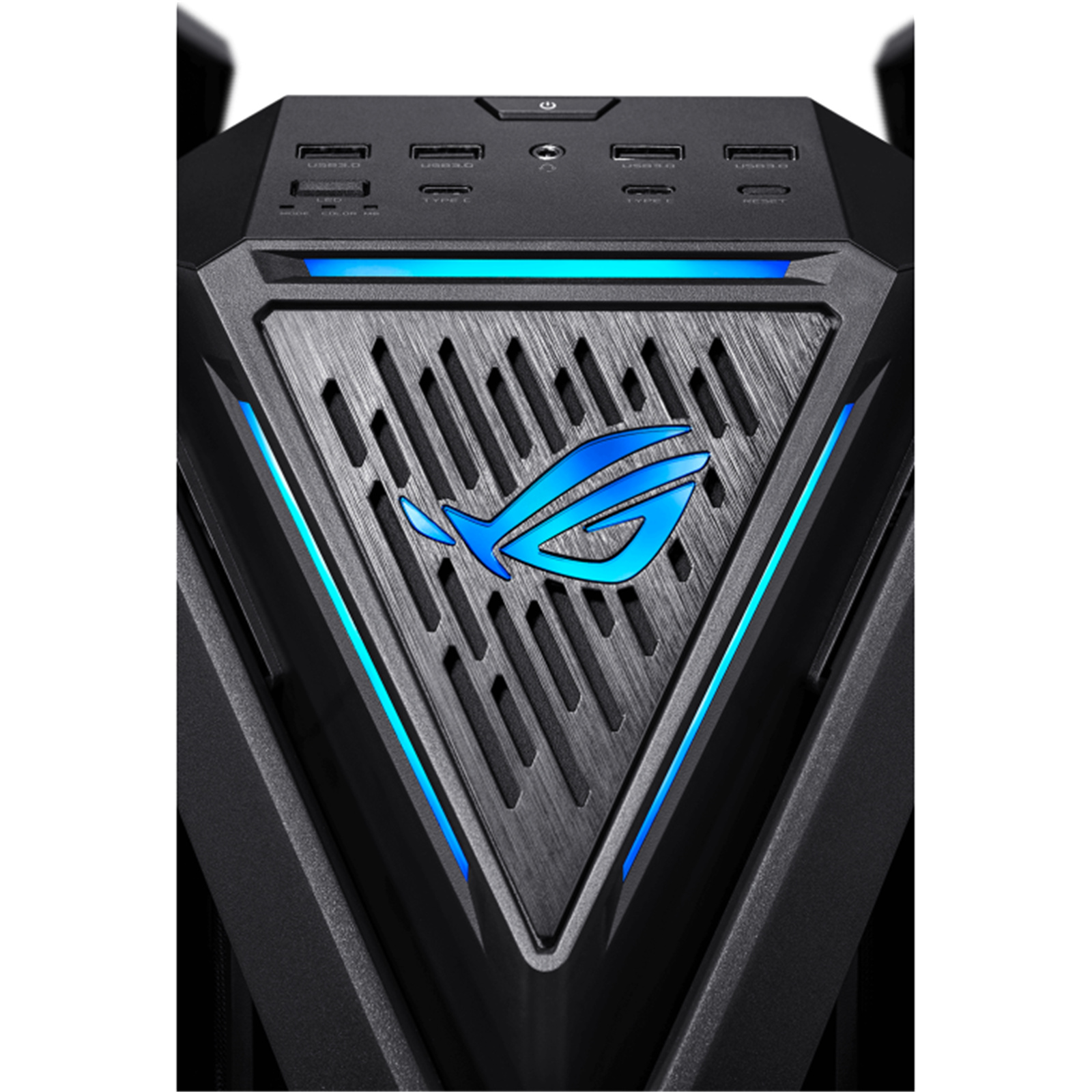 The front of any ROG chassis has to offer a host of connectors, and the ROG Hyperion adds to the tradition with two USB Type-C® connectors that can offer up to 20 Gbps of data transfer and up 60 watts of fast charging with a compatible motherboard.