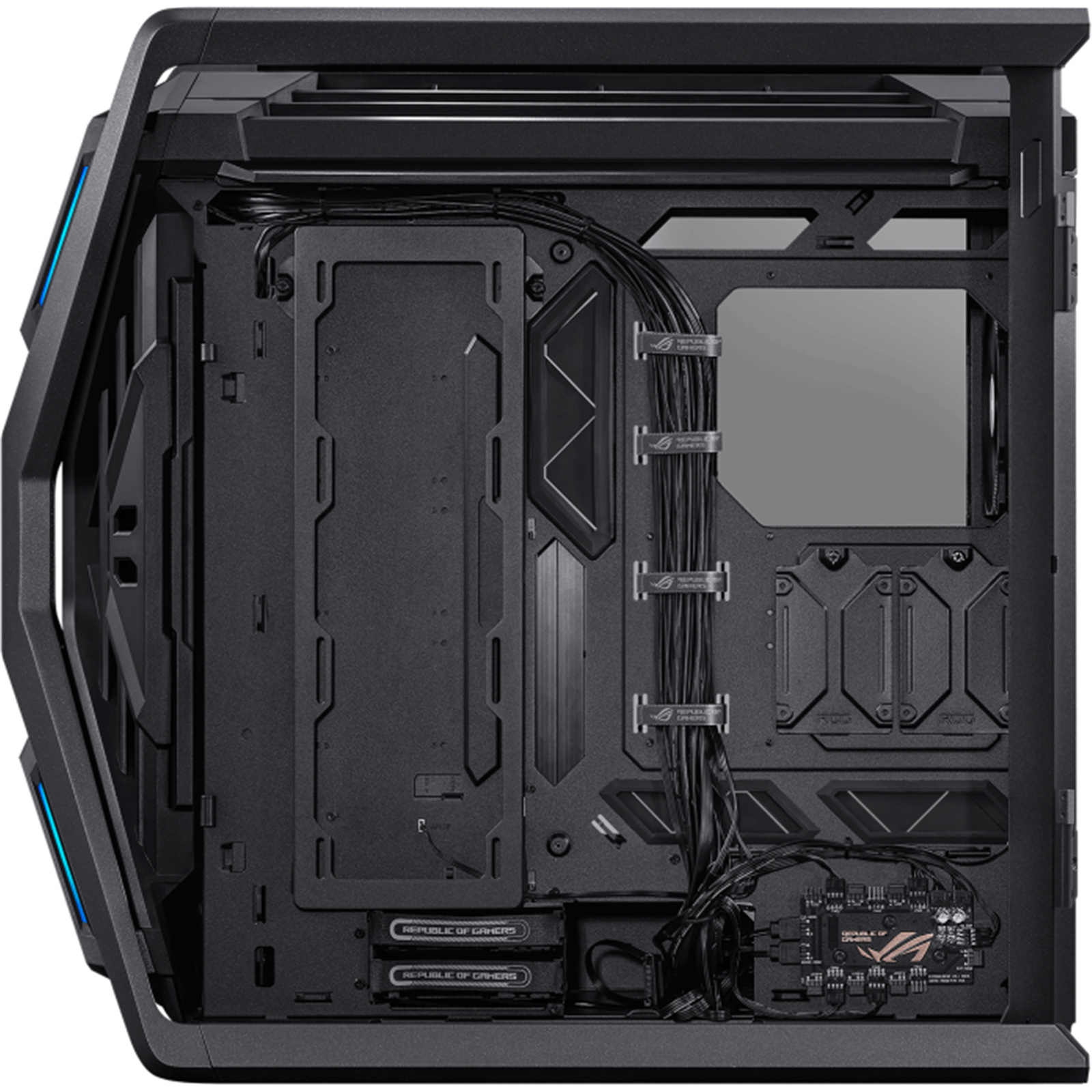 In between the motherboard tray and the front of the chassis sits an innovative vertical installation area that can support a variety of needs. Builders can mount multiple system fans and 2.5-inch SSDs, or a 360 mm radiator, liquid cooling distribution panel, or ROG-themed lighting panel.