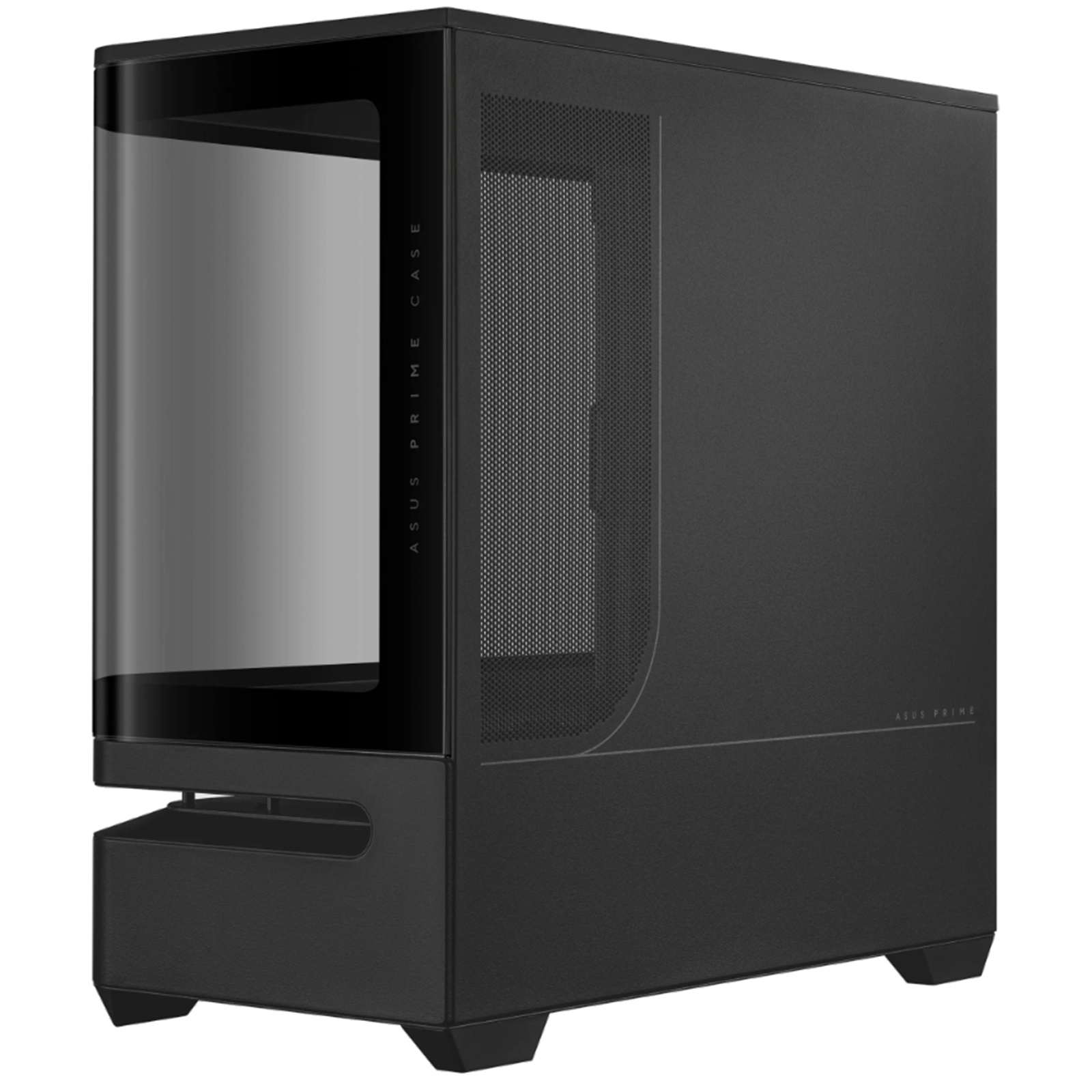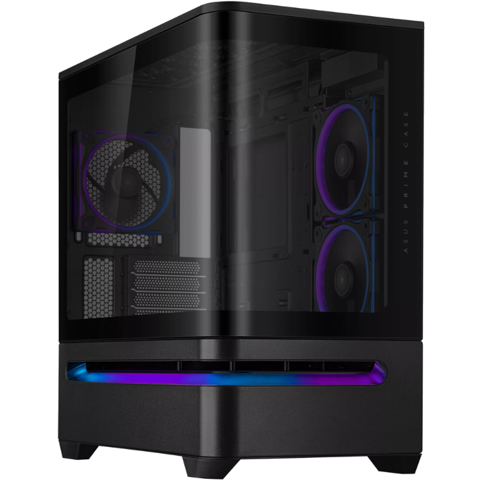 - Curved tempered glass panel extends seamlessly from the front to the side, offering a panoramic view of the components from almost any angle