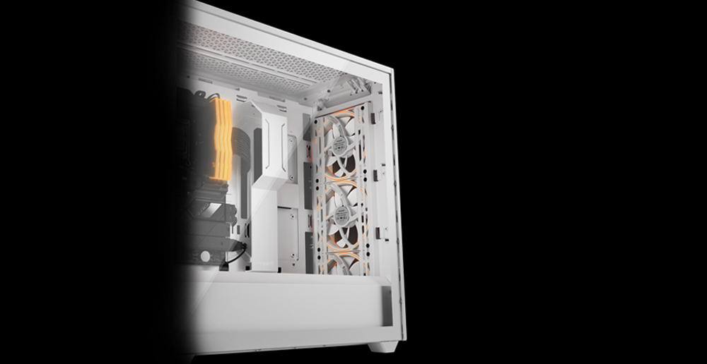 With its remarkably large dimensions, Shadow Base 800 FX White sets no limits on creativity. It can accommodate radiators up to 420mm, E-ATX motherboards and even the largest graphics cards.