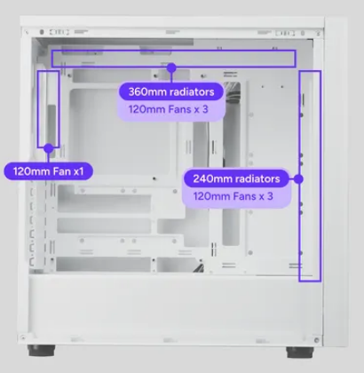 Supports up to seven 120mm fans and either a top-mounted 360mm radiator or a front-mounted 420mm radiator, offering hyper-effective CPU thermal performance.