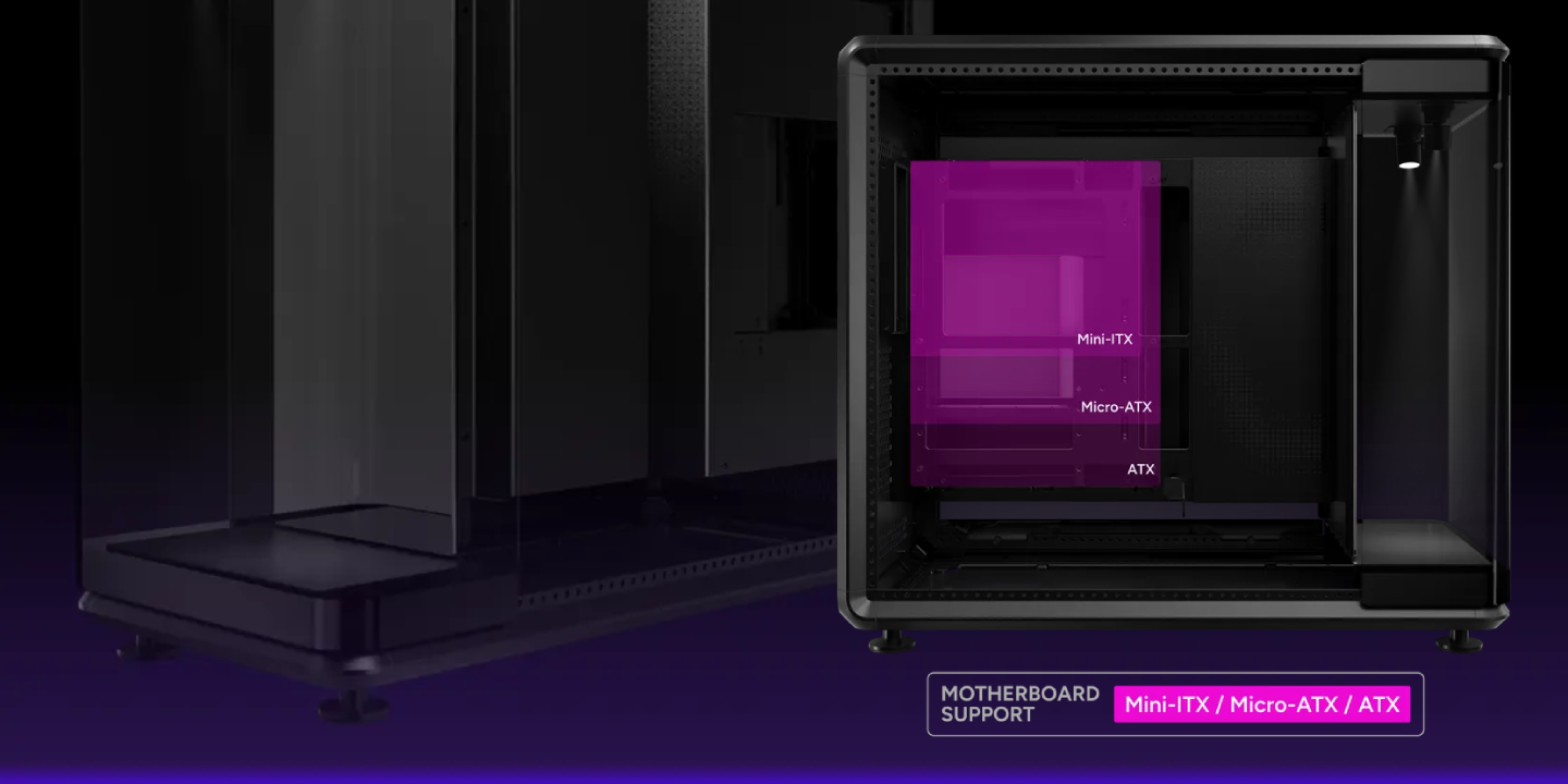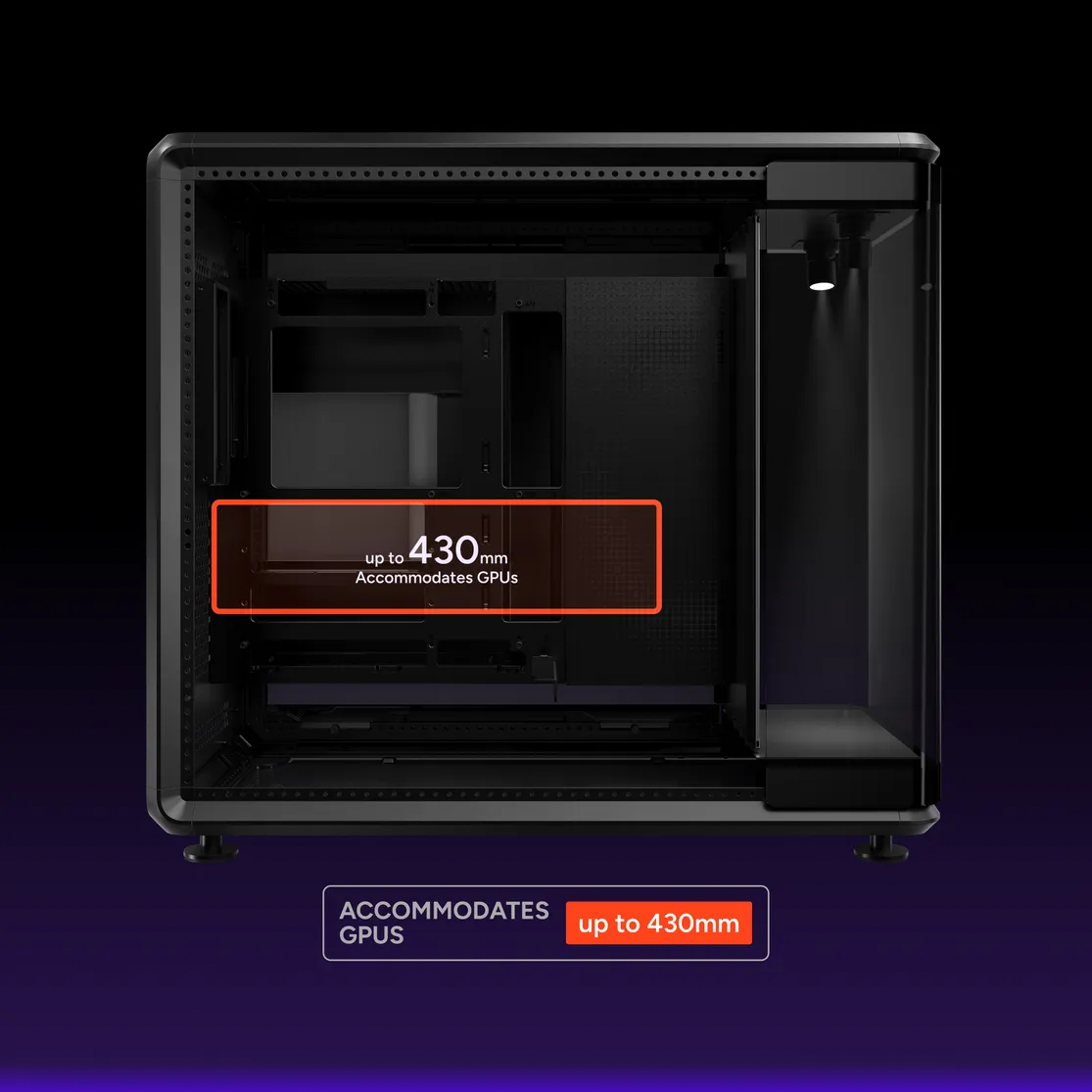 Accommodates up to 430 mm GPUs and 210 mm PSUs built to handle flagship components without compromise. Also compatible with Mini-ITX, Micro-ATX, and ATX motherboards, including BTF (back-connect) layouts within the ATX form factor.
