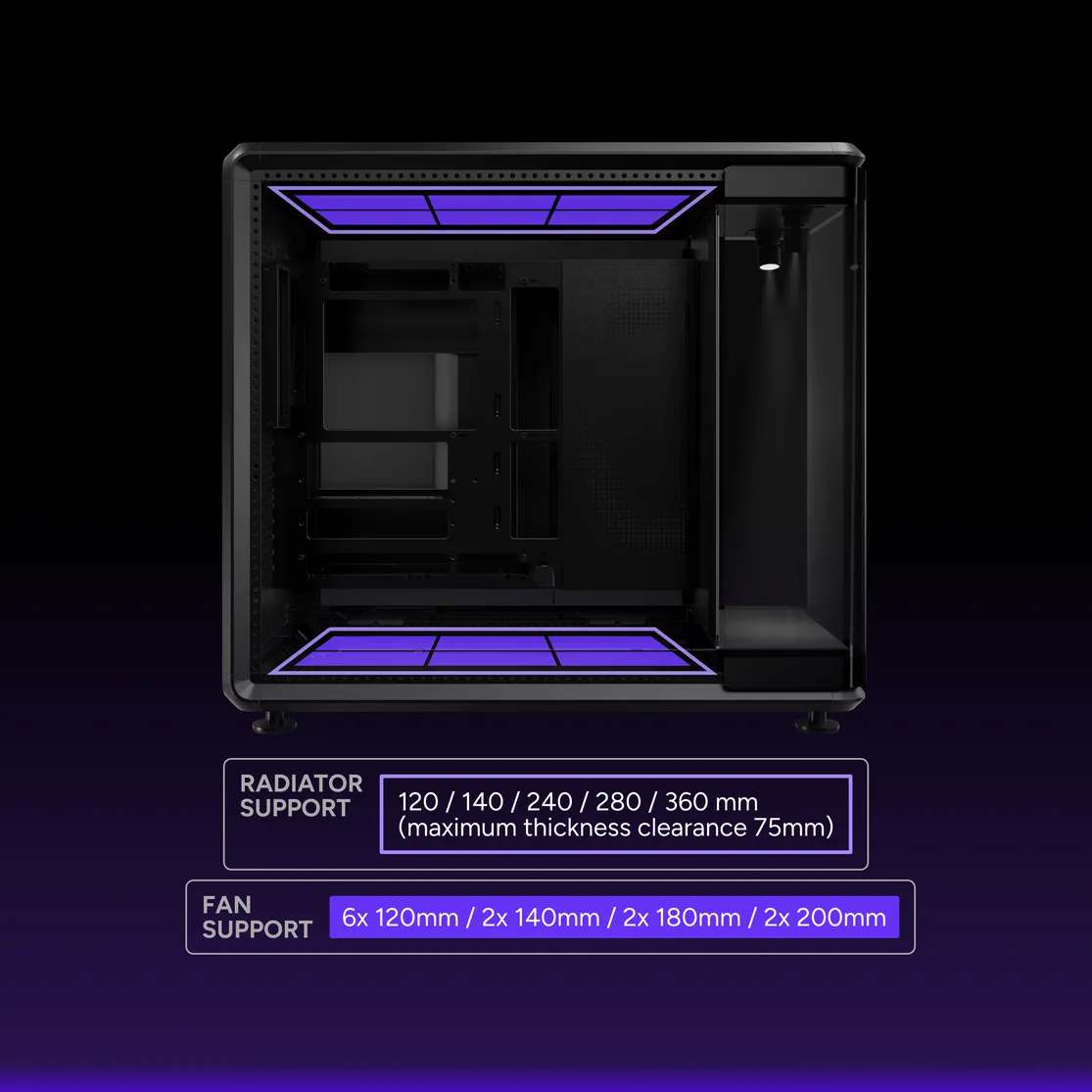 Supports fan sizes ranging from 120 mm to 200 mm, with space for up to twelve 120 mm fans-six on the top and six on the bottom. It also supports radiators up to 360 mm, meeting the cooling demands of high-end custom liquid cooling setups.