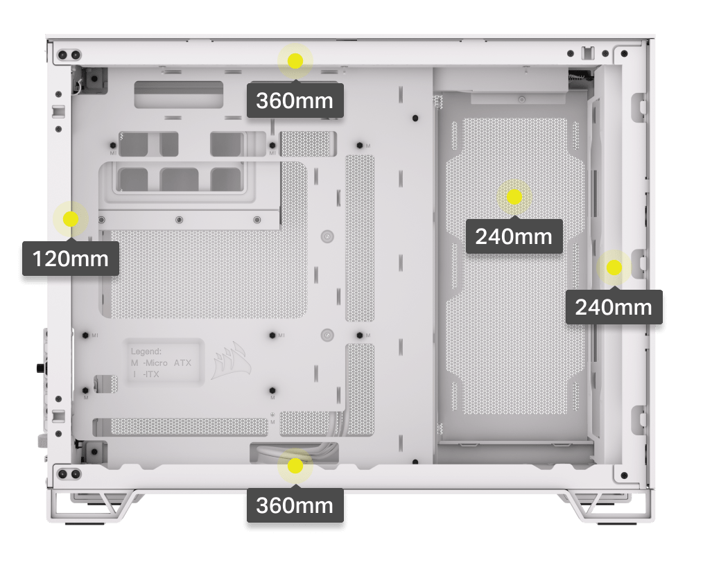 Corsair 2500D Airflow Tempered Glass mATX Gaming Case - White CPU Cooler Support up to 180mm - GPU Support up to 400mm - 360mm Radiator Support - 4x PCI (4 Vertical with Accessory) - Front 1x USB-C - 2x USB - HD Audio